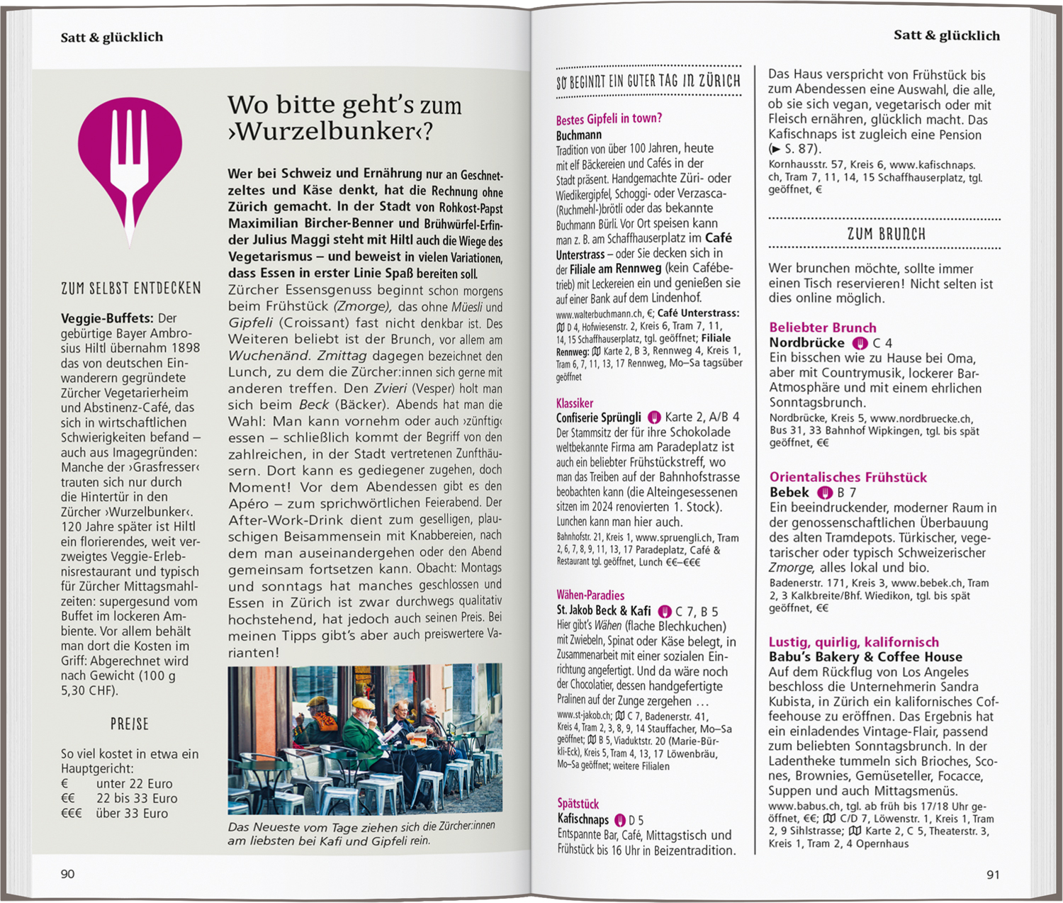 Mit den Übersichtskarten, genauen Stadtteilplänen und dem separaten großen Cityplan können Sie sich nach Lust und Laune durch Zürich treiben lassen.