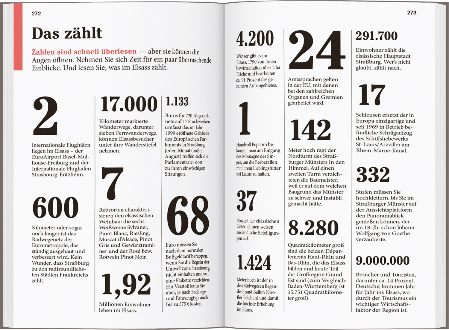 Senkrechtstarter, Überflieger, Querfeldein. Vor Ort - die Kapitel: Straßburg und das Große Ried, Nordelsass, Elsässische Weinstraße, Colmar und die Rheinebene, Vogesen, Mulhouse und der Sundgau. Das Kleingedruckte (Reiseinfos von A bis Z). Das Magazin. Offene Fragen.