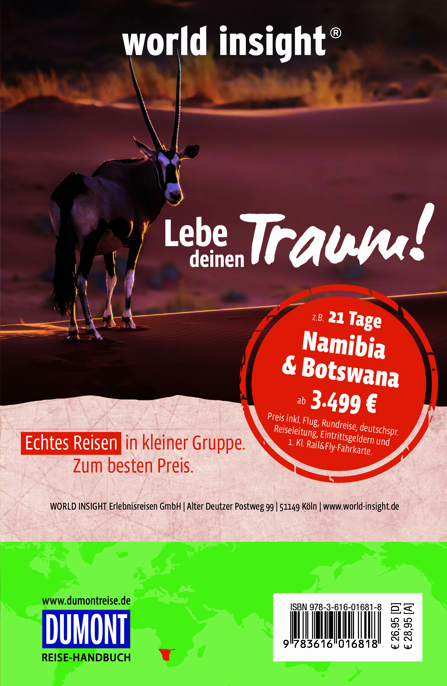 Dieser Namibia-Reiseführer macht das Planen, Ankommen und Erleben leicht. Nützliche Tipps von der Anreise bis zur Unterkunftssuche helfen bei der Vorbereitung. In den Kapiteln zur Landeskunde lernen Sie Ihr Reiseziel noch besser verstehen. Die ausführlichen Beschreibungen der einzelnen Regionen und Städte halten Sightseeing-Tipps und Tourenvorschläge für jeden Reisegeschmack bereit. Ob Sie durch Windhoeks Townships radeln, zum White-Water-Rafting auf dem Sambesi aufbrechen oder sich auf die Suche nach den Wüstenelefanten begeben: Das Reise-Handbuch von DUMONT bringt Sie zu den schönsten Ecken Namibias und sorgt für Urlaubsmomente, die Sie nicht vergessen werden!
