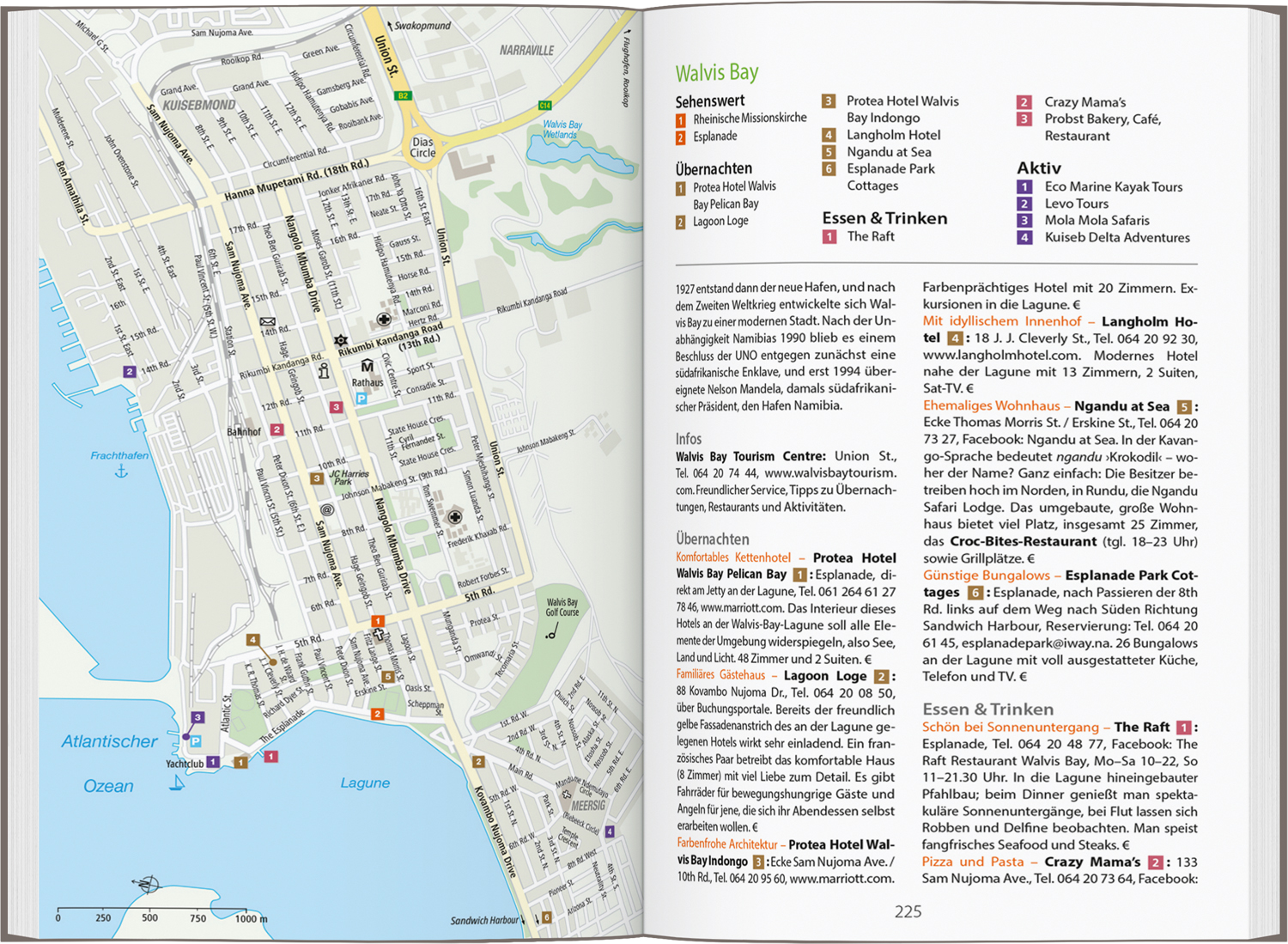 - 34 Karten und Pläne plus eine separate Namibia-Reisekarte im Maßstab 1:1.500.000.