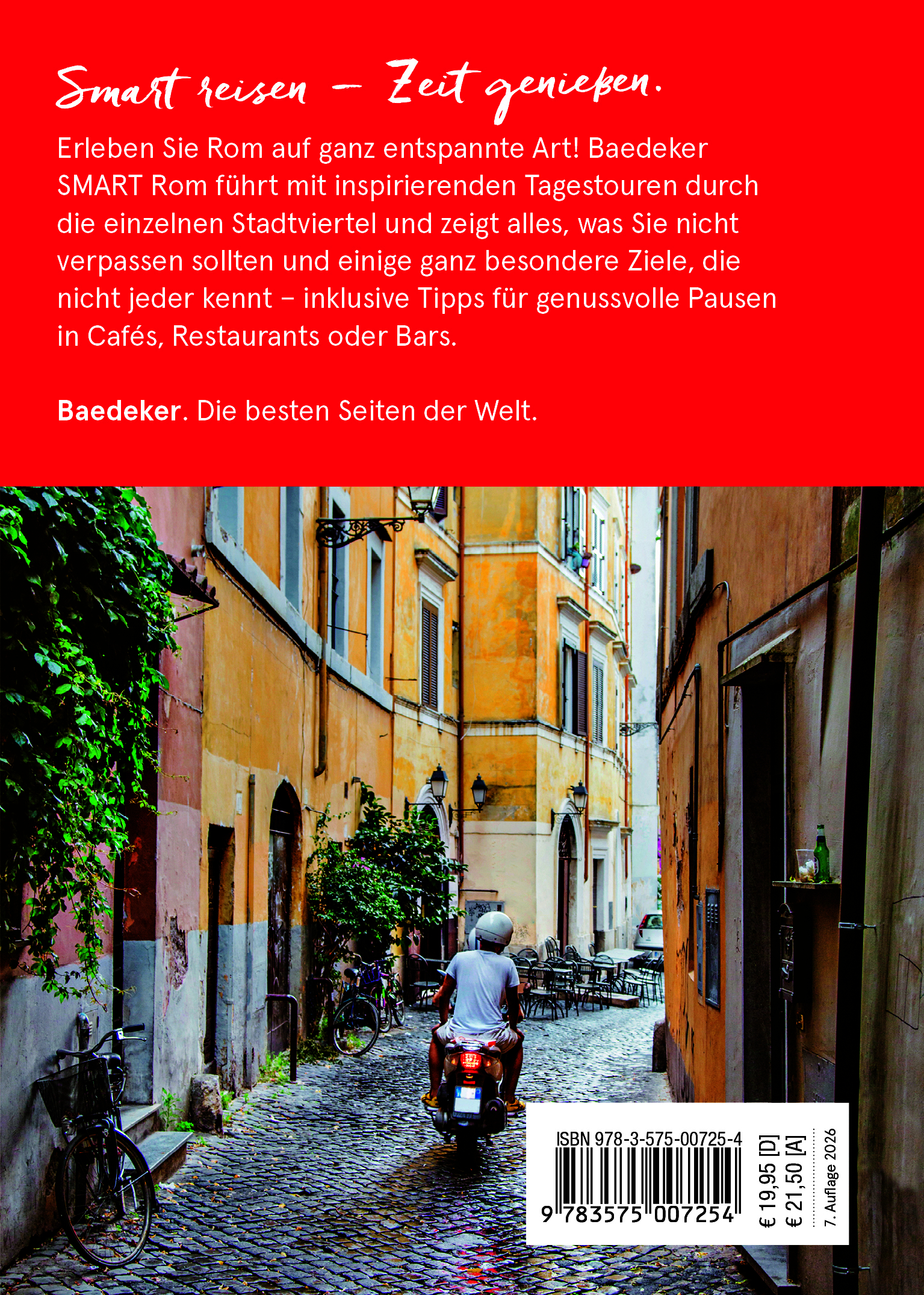 Rom, die Ewige Stadt! Die antike Metropole begeistert mit ihrer einzigartigen Fülle an kulturellen Schätzen. Spazieren Sie über das Forum Romanum und bewundern Sie die Ruinen des Kolosseums, einstiger Schauplatz von Gladiatorenkämpfen und heutiges Wahrzeichen Roms. Besichtigen Sie Pantheon oder Petersdom, Spanische Treppe oder Sixtinische Kapelle - die Liste berühmter Sehenswürdigkeiten ist schier unendlich. Und genießen Sie das Dolce Vita der italienischen Hauptstadt in entzückenden Cafés, kulinarischen Gourmettempeln und Shoppingparadiesen. Mit dem Baedeker SMART haben Sie den perfekten Reiseführer an Ihrer Seite, der Sie das Außergewöhnliche der Ewigen Stadt entdecken lässt.