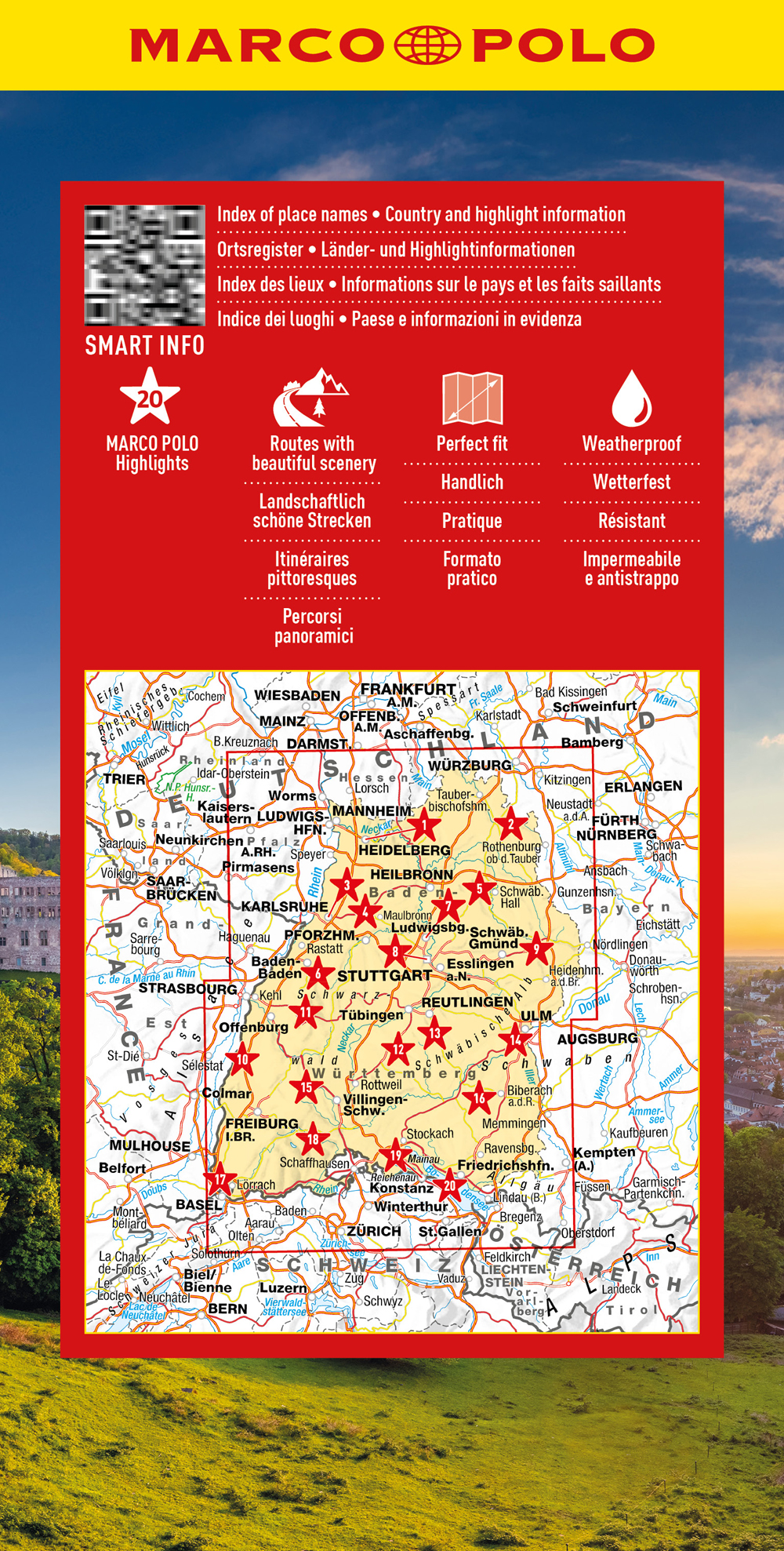 Kein Highlight mehr verpassen - die MARCO POLO Karte zeigt die bedeutendsten kulturellen und landschaftlichen Sehenswürdigkeiten auf der Karte und in einer zusätzlichen Online-Sammlung. Im schützenden Kartondeckel sind einige der interessantesten Orte mit Fotos abgebildet. Die Karte ist beidseitig bedruckt und herausnehmbar. Dank dem digitalen Register kann einfach nach Orten gesucht werden. Eine übersichtliche und detailreiche Kartografie macht es einfach, die Karte zu lesen. Auf der Rückseite des Deckels befindet sich eine Übersichtskarte mit allen Highlights. Hilfreiche Details und Verkehrsinformationen machen die Reisekarte auch zur perfekten Straßenkarte: entspannt ankommen und alles gesehen haben.
