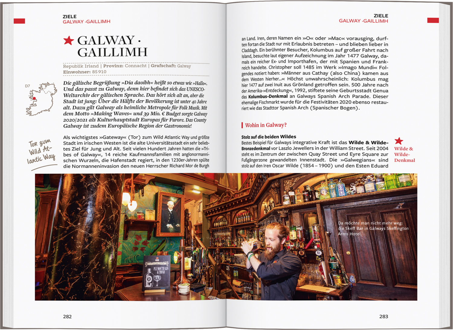Endlos grüne Hügellandschaften und saftiges Weideland - Irland wird nicht umsonst auch als die "grüne Insel" bezeichnet. In unserem Reiseführer Irland bringen wir Ihnen aber nicht nur die Natur des Landes näher, sondern nehmen Sie mit in quirlige Städte wie Galway, Waterford, Belfast, Limerick oder Cork und natürlich auch in die Hauptstadt Dublin. Fünf inspirierende Tourenvorschläge führen Sie auf Ihrer Irland-Rundreise entlang der Küste zum "Ring of Kerry", Irlands Panoramastraße um die Halbinsel Iveragh, zeigen Ihnen historische Monumente aus der Keltenzeit und Landschaften wie den wildromantischen Connemara Nationalpark oder die berühmten Cliffs of Moher. Unsere Reisetipps verraten, wo Sie die urigsten Pubs finden, in denen Sie typisch irischen Whiskey oder das bekannte Kilkenny Ale genießen können, und zeigen Ihnen, wie Sie Irlands Sehenswürdigkeiten entspannt erleben - damit Ihr Irland-Urlaub einfach unvergesslich wird.