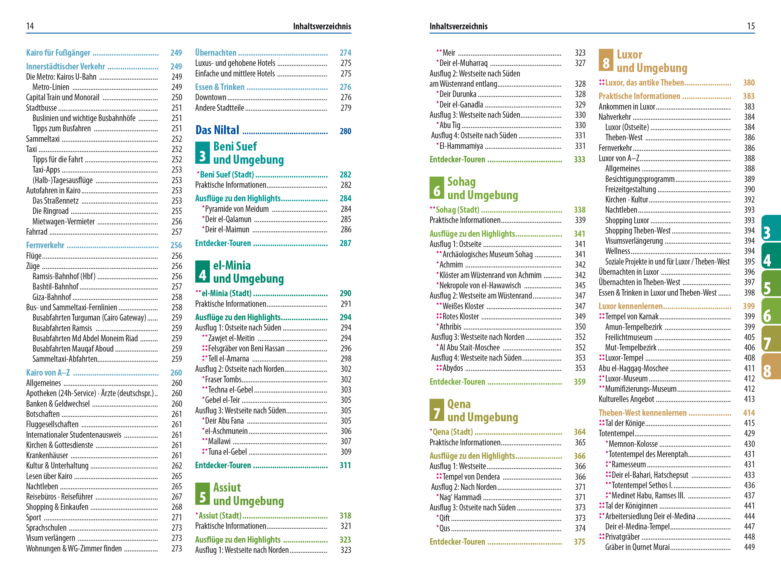- Umfassende Beschreibungen aller wichtigen Regionen: Von Kairo und Gizeh über Mittel- und Oberägypten bis Abu Simbel, dazu Suez-Kanalund die Küstenstädte am Roten Meer wie Hurghada und Marsa Alam