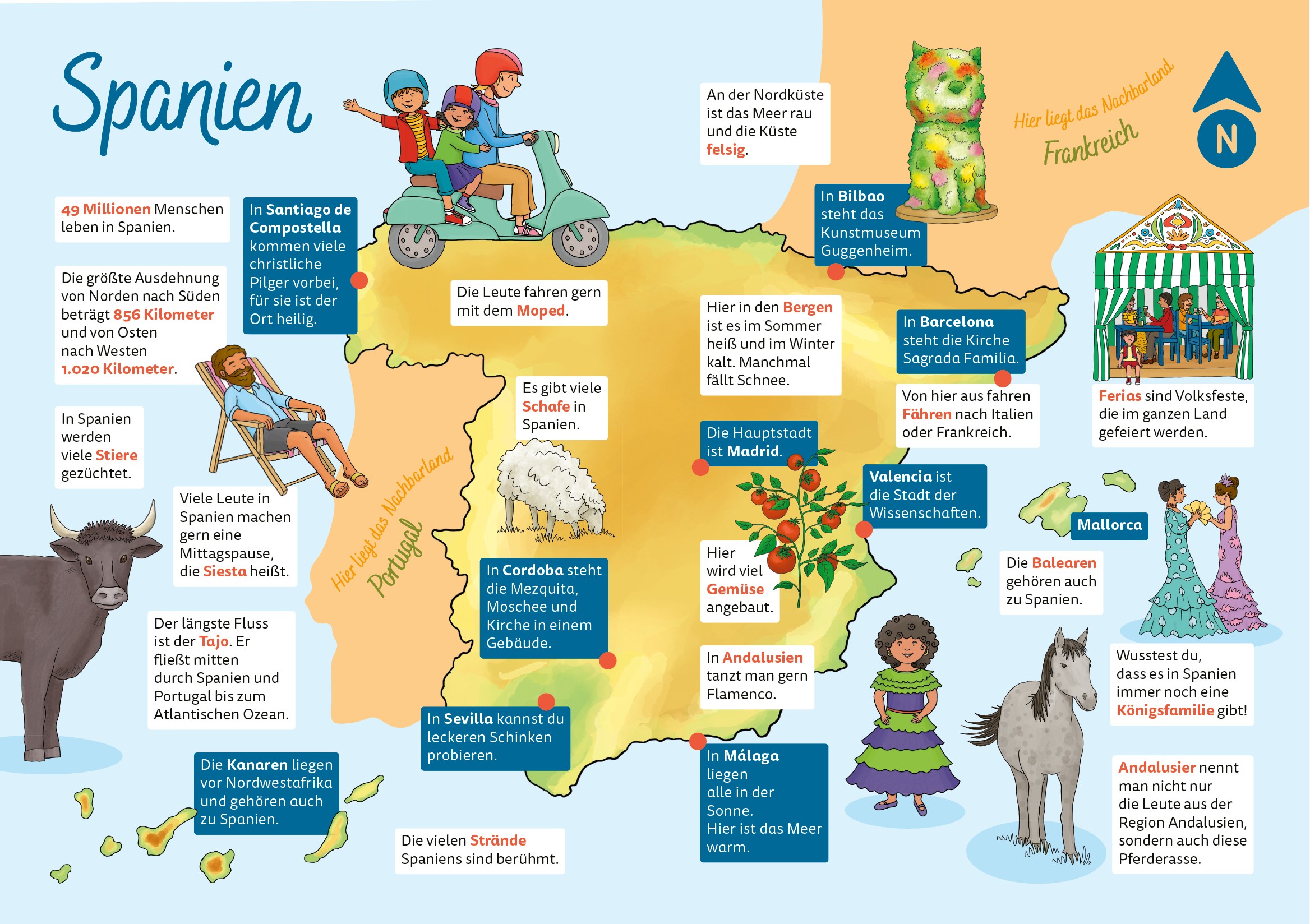 🏰 Mit kindgerechten Illustrationen lernen deine Kinder spielerisch die spanischen Besonderheiten kennen: die berühmte Siesta, leckere Tapas, feurigen Flamenco und die beeindruckende Sagrada Familia.