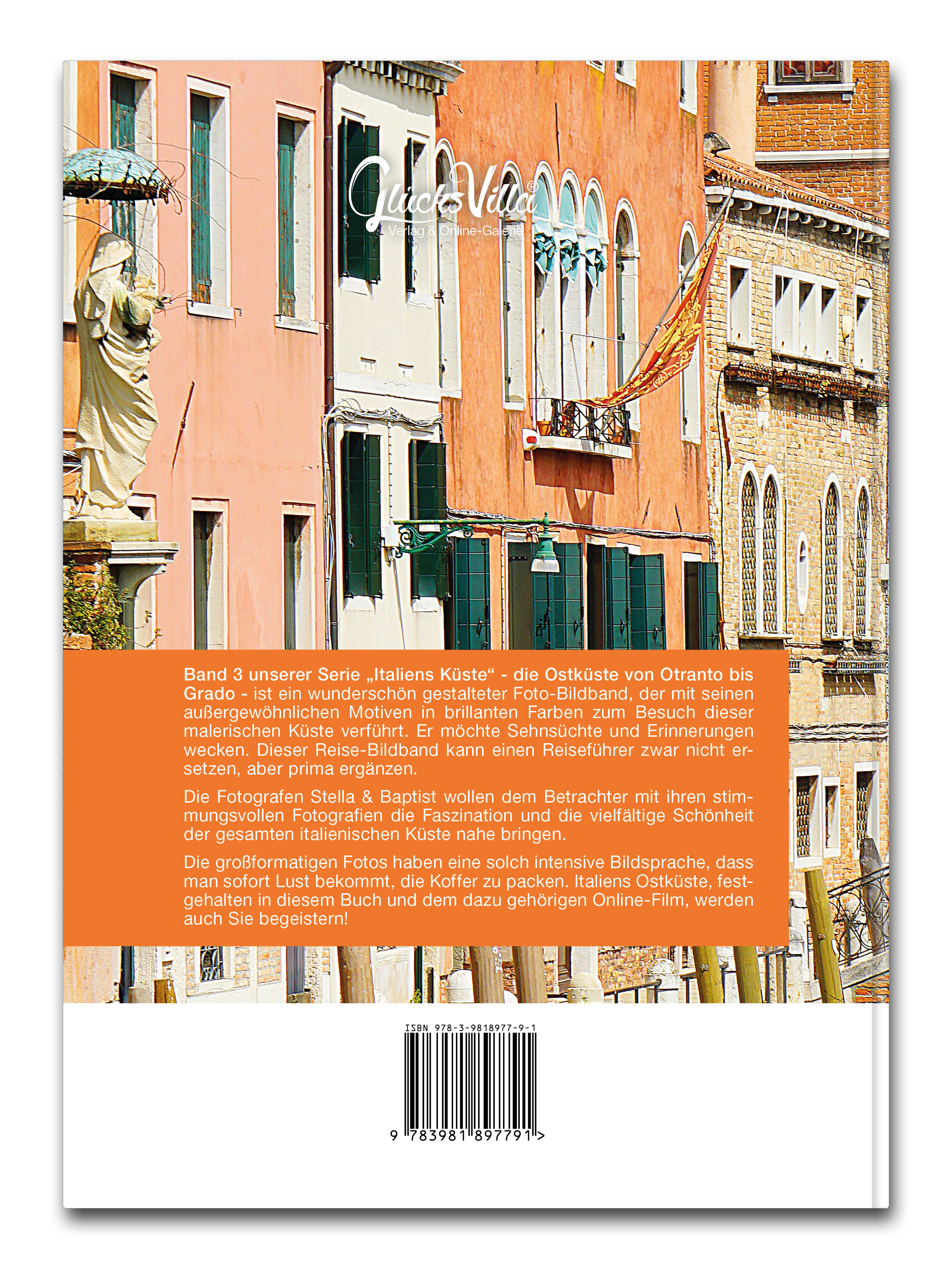 | Zusatzinfo | Großformatige, farbige Fotografien von Stella & Baptist (Manuela & Thomas Fischer), Momentaufnahmen & Impressionen, Italien, Küste (Ostküste) von Otranto bis Grado, Regionen: Apulien, Molise, Abruzzen, Marken, Emilia-Romagna, Venetien, Friaul-Julisch-Venetien, Landschaften, Meer, Strände, Fischerdörfer, malerische Häfen, Küstenstädte, Bergdörfer, historische Altstadtgassen, Centro Storico, Sehenswürdigkeiten |