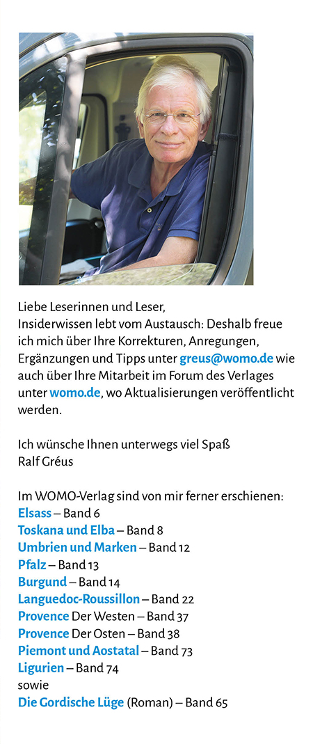EinladungSeit meinem ersten Wohnmobilführer über das Elsass und dieVogesen hat es viele Jahre gedauert, bis ich mich mit den Gebietenöstlich des Rheins angefreundet habe. Mit wachsenderBegeisterung sind wir von Schwetzingen, unserem Wohnort in derKurpfalz, anfangs zu kürzeren Ausflügen aufgebrochen, nachdenen ich erste Texte verfasst und Fotos archiviert habe.Dann brach die Corona-Pandemie über uns herein, und wir verbrachtenmehr Zeit im Schwarzwald, am Kaiserstuhl und am Bodensee,als wir es jemals vorhatten. Keine Minute davon mochtenwir damals missen, kein Kilometer war uns zu viel. Nicht einmaldie zahlreichen Menschen, die erstmals eine Wohnmobilreise fürsich entdeckt hatten und am Bodensee endlich ihre Heimat kennenlernenwollten, konnten unsere Freude an diesem schönenUrlaubsziel ernsthaft trüben. Vor allem den Schwarzwald habenwir als ideales Wohnmobilrevier entdeckt.Fünf Jahre später, als die typischen Wohnmobilreiseländer längstwieder zugänglich waren, haben wir nachgesehen, ob wir damalsnur zu blauäugig waren, ob wir uns die deutschen Ziele schöngeredet haben und ob man dafür überhaupt die schriftliche Anleitungdurch einen Reiseführer benötigt. Unser Vergnügen wardabei nochmals gewachsen, denn wir wussten aufgrund der Erfahrungennun besser, wo genau konkrete Unternehmungensinnvoll waren, die wir ohne eingehendere Recherche so nichterlebt hätten.Davon können Sie profitieren, und dabei wünsche ich Ihnen vielVergnügen