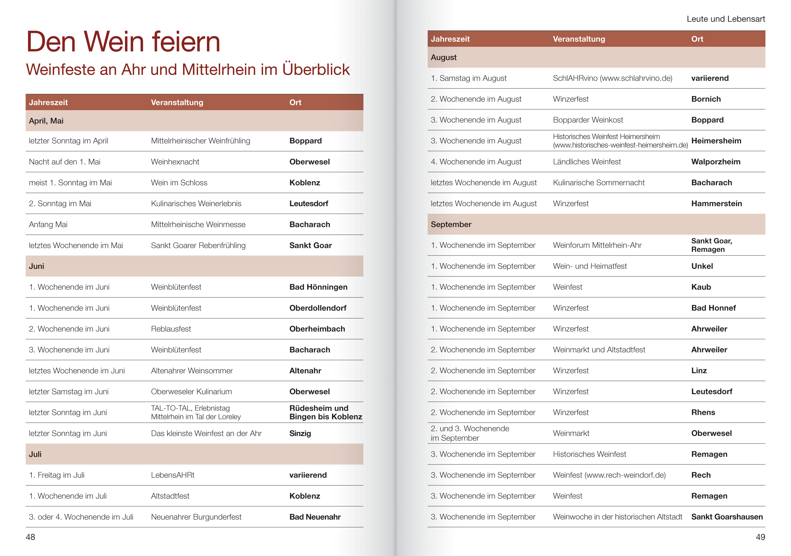 DIE REGION UND IHR WEIN:- Weinlandschaft entdecken - Aktiv unterwegs an Ahr und Mittelrhein- Terrassen, Täler, Trauben - Wo die Natur es gut gemeint hat- Edle Rote - weiße Klassiker - Rebsorten an Ahr und Mittelrhein- Tatort Weinberg - Die Arbeit des Winzers im Jahresspiegel- Know-how und Timing - Wie wird's ein guter Wein?- SPEZIAL: Biowein - Ein dauerhafter TrendBLICK IN DIE GESCHICHTE:- Römer, Franken, Burgen - Die Zeiten früher Rhein-Siedler- Geschichte im Überblick- SPEZIAL: Der Loreleyfelsen bei Sankt Goarshausen - Rhein-Natur purLEUTE UND LEBENSART:- Der Rheinländer - Lebensfreude und ein Gläschen Wein- Küche deftig, feiern kräftig - Rund ums Essen und Feiern- Den Wein feiern - Weinfeste an Ahr und Mittelrhein im Überblick- SPEZIAL: Rhein in Flammen - Festlicher FunkenregenWEINORTE AN DER AHR:- Von Altenahr bis Rech- SPEZIAL: Der RotweinwanderwegWEINORTE AM MITTELRHEIN:- Von Andernach bis WeinährWEINWISSEN:- Qualität und Etikett- Die Weinsprache - Wie man Geschmack beschreiben kann- Kleines WeinlexikonZUM NACHSCHLAGEN:- Reisekarte Ahr & Mittelrhein- Index der Sehenswürdigkeiten- Index der Weingüter- Abbildungsnachweis- Impressum