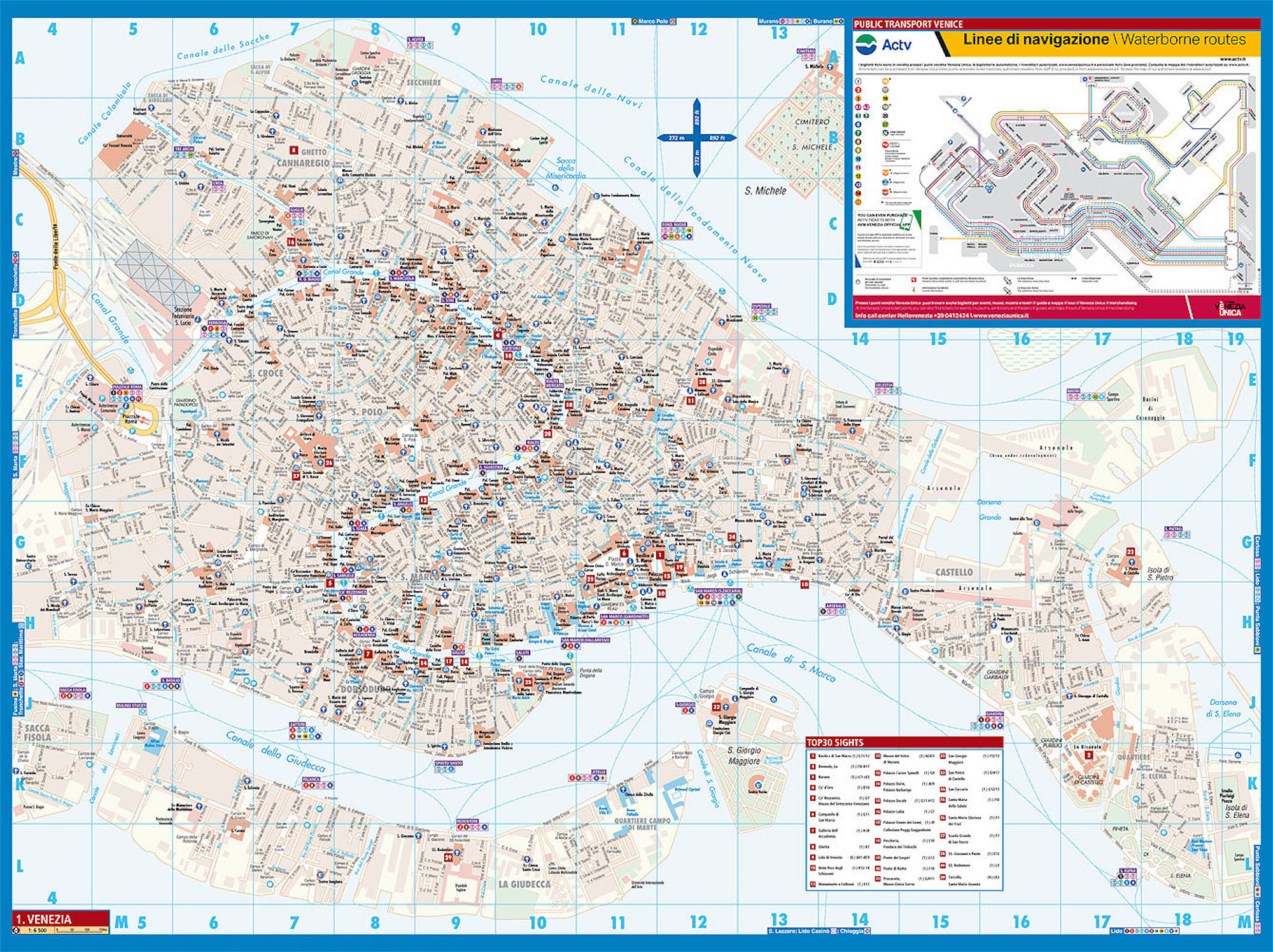 Unsere folienbeschichtete und gefaltete Borch Map von Venedig in der 19. Auflage beinhaltet: Venedig 1:6 500, Laguna Veneta 1:95 000, Murano 1:8 000, Torcello 1:8 000, Burano 1:8 000, Lido 1:13 500, Veneto 1:900 000, das öffentliche Wasserbus-Liniennetz von Venedig (Vaporetti) und eine administrative Übersichtskarte von Italien. Borch Maps beinhalten eine Vielzahl interessanter und nützlicher Informationen wie Top Sights, Museen, Monumente, Märkte und viele weitere Sehenswürdigkeiten, aber auch Statistiken, Umrechnungstabellen, Klimadiagramme und viele detailreiche Übersichtskarten, die eine Borch Map zu einem exzellenten Reisebegleiter machen. Kartenformat (offen): 660 x 494 mm.