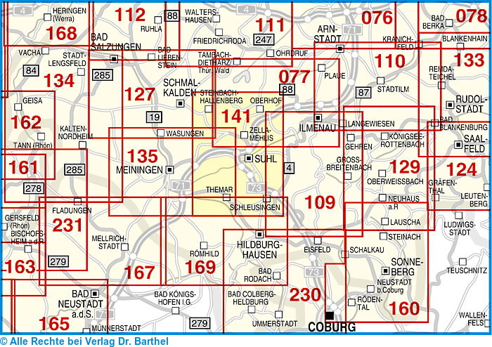 | Schlagworte | Benshausen, Viernau, Frauenwald, Schleusegrund, Auengrund, Nahetal-Waldau • Eisenach-Budapest, Rennsteig-Rhön-Weg, Rennsteig-Dolmar-Weg, Gipfel-Wanderweg • Kelten-Erlebnisweg, Archäologischer Wanderweg • Oberschönau, Unterschönau, Rotterode, Bermbach, Geraberg, Suhl, Zella-Mehlis • Oberstadt, Schmeheim, Marisfeld, Kloster Veßra, Kleiner Thüringer Wald, Vessertal • Radweg am Rennsteig, Geratal-Radwanderweg, Werratal-Radwanderweg, Rennsteig • Steinbach-Hallenberg, Themar, Schleusingen, Schmiedefeld, Gehlberg, Oberhof • St. Kilian, Ehrenberg, Grimmelshausen, Henfstädt, Eichberg, Bischofrod, Grub • Suhl (Umgebung), Karte; Radkarte • Suhl (Umgebung), Karte; Wanderkarte • Suhl (Umgebung); Radkarten • Suhl (Umgebung); Wanderkarten • Waffenmuseum, Biathlonstadion, Ilmbrunnen, Bertholdsbrunnen, Hennebergisches Museum • Zella -Mehlis (Umgebung), Karte; Radkarte • Zella -Mehlis (Umgebung), Karte; Wanderkarte • Zella -Mehlis (Umgebung); Radkarten • Zella -Mehlis (Umgebung); Wanderkarten |