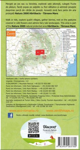 Harta cuprinde zona Podisului Hârtibaciului fiind singura din colectie care are pe ambele fete harta deoarece acopera o suprafata mare. Harta contine 250 Km de trasee de drumetie si cicloturism care fac legatura între sate peste dealuri si vai dar si un traseu principal care urmeaza culmea de ape dintre Târnava Mare si Hârtibaci (banda rosie).