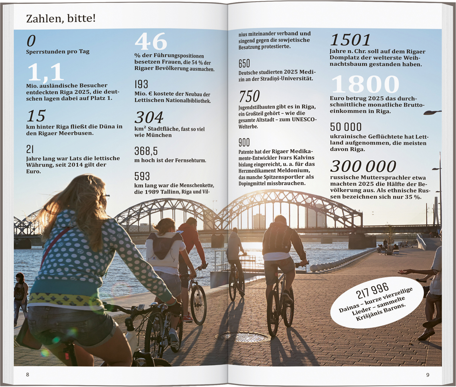 In eigenen Kapiteln erfahren Sie, wo es sich in fremden Betten gut schläft, wo Sie glücklich satt werden, wohin die Rigaer zum Stöbern und Entdecken gehen und wohin es sie zieht, wenn die Nacht beginnt.