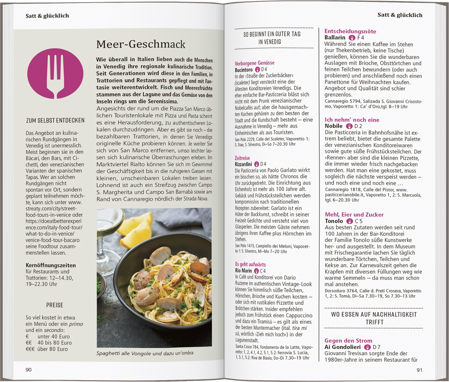 In eigenen Kapiteln erfahren Sie, wo es sich in fremden Betten gut schläft, wo Sie glücklich satt werden, wohin die Venezianer zum Stöbern und Entdecken gehen und wohin es sie zieht, wenn die Nacht beginnt.