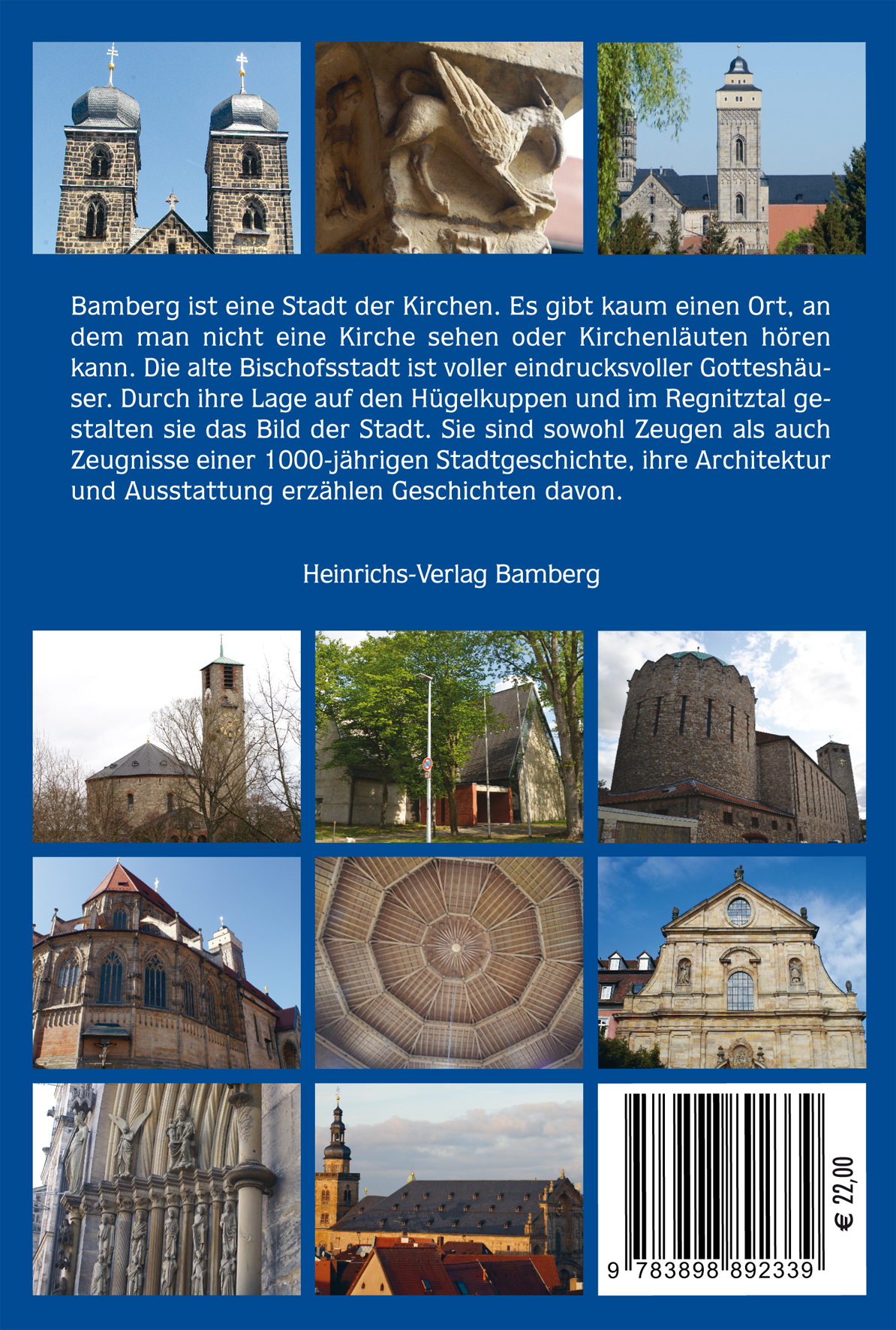 Bamberg ist eine Stadt der Kirchen. Es gibt kaum einen Ort, an dem man nicht eine Kirche sehen oder Kirchenläuten hören kann.Die alte Bischofsstadt ist voller eindrucksvoller Gotteshäuser. Durch ihre Lage auf den Hügelkuppen und im Regnitztal gestalten sie das Bild der Stadt. Der Leser macht eine Art Entdeckungstour, bei der die Besonderheiten der Architektur, der Gemälde und Skulpturen sowie der Ausstattung aufgespürt und sinnlich erfahren werden.Eine "Anleitung zum Sehen" lässt die Gebäude und Kunstwerke als Zeugen und Zeugnisse der wechselvollen Geschichte erkennen.