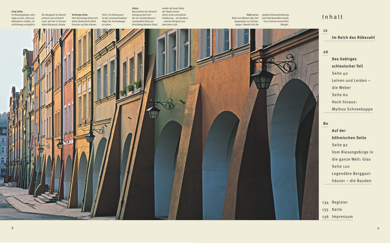 Über 180 Bilder zeigen die herrliche Welt des Riesengebirges. Vier Specials berichten über die berühmten Glasmacher, die Bauden - die typischen Berggasthäuser -, die sagenumwobene Schneekoppe und die lange Tradition der Weberzunft im Riesengebirge.