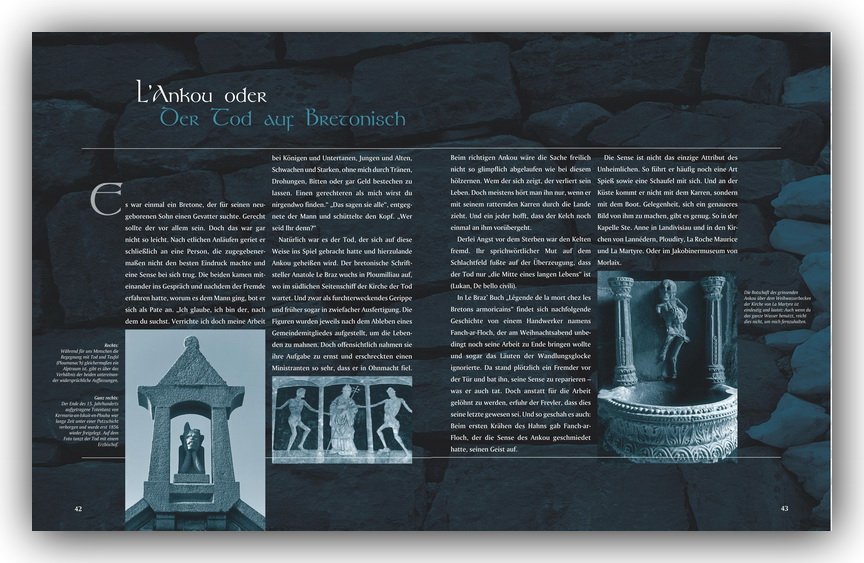 Kein Wunder, dass auch das Christentum dieses erstaunliche Erbe aus megalithischer und keltischer Zeit nicht verdrängen konnte. Im Gegenteil: Es wurde listig unterlaufen. Von den unzähligen Heiligen, die man in der Bretagne verehrt, haben die wenigsten den Segen des Papstes. Doch das schmälert ihre Wunderkräfte nicht im Geringsten. Der Verdacht, dass manches an diesen Heiligen und in der Bretagne überhaupt sehr heidnisch ist, wird durch den Anblick der unvergleichlichen Kalvarienberge (calvaires) noch gestützt. In einer solchen Umgebung ist es nur zu verständlich, dass nicht nur die Kirchen und Klöster, sondern auch die Burgen und Schlösser, sowie Plätze, Dörfer, Städte und Landschaften - hier vor allem das Finistère, das "Ende der Welt" - von Legenden und Mythen schier überquellen.