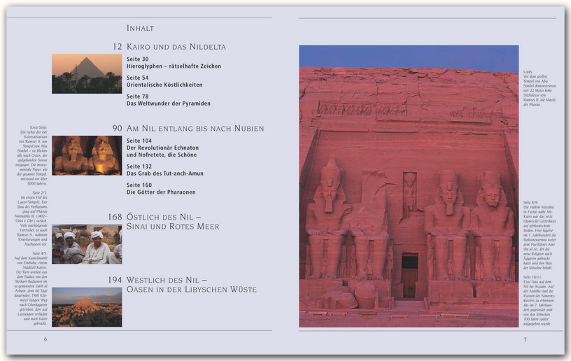 Vom Nildelta mit seinen fruchtbaren Äckern, den Fluss entlang bis zum Nasser-Stausee, vom Sinai, der Landbrücke zwischen Afrika und Asien mit ihren Küstenlandschaften am roten Meer, bis zu den Oasen in der Libyschen Wüste zeigen über 300 Bilder alle Facetten und Regionen des faszinierenden Landes.