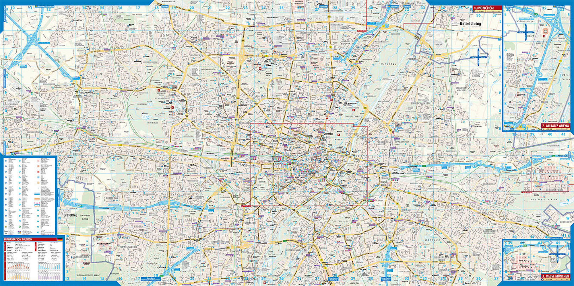 Unsere folienbeschichtete und gefaltete Borch Map von München in der 8. Auflage beinhaltet: München Innenstadt 1:11 000, München 1:22 000, München Großraum 1:130 000, die Messe München 1:22 000, die Allianz Arena 1:22 000, das Voralpenland 1:850 000, das öffentliche Verkehrsnetz des MVV und eine administrative Übersichtskarte von Deutschland. Borch Maps beinhalten eine Vielzahl interessanter und nützlicher Informationen wie Top Sights, Museen, Monumente, Märkte und viele weitere Sehenswürdigkeiten, aber auch Statistiken, Umrechnungstabellen, Klimadiagramme und viele detailreiche Übersichtskarten, die eine Borch Map zu einem exzellenten Reisebegleiter machen. Kartenformat (offen): 990 x 494 mm.