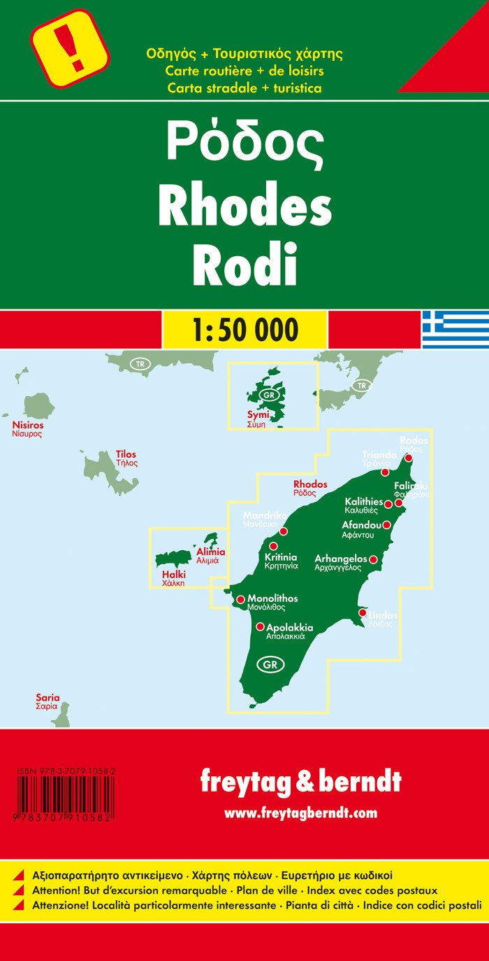 Neben der übersichtlichen Gestaltung bietet die Straßenkarte Rhodos 1:50.000 zahlreiche Zusatzinformationen wie z.B. Straßenbeschaffenheit, Sehenswürdigkeiten, Campingplätze und diverse Innenstadtpläne. Mit dem umfangreichen Ortsregister gelingt zudem eine rasche Orientierung. Im beiliegenden, mehrsprachigen Freizeitführer werden besondere Ausflugsziele der Insel empfohlen und kurz beschrieben. (Sprachen: Griechisch, Deutsch, Englisch, Französisch, Italienisch, Spanisch, Niederländisch, Tschechisch, Slowakisch, Ungarisch). Details: Besondere Ausflugsziele, Cityplan Rhódos-Stadt, Ortsregister mit Postleitzahlen. freytag & berndt Autokarten sind für viele Länder und Regionen weltweit erhältlich.