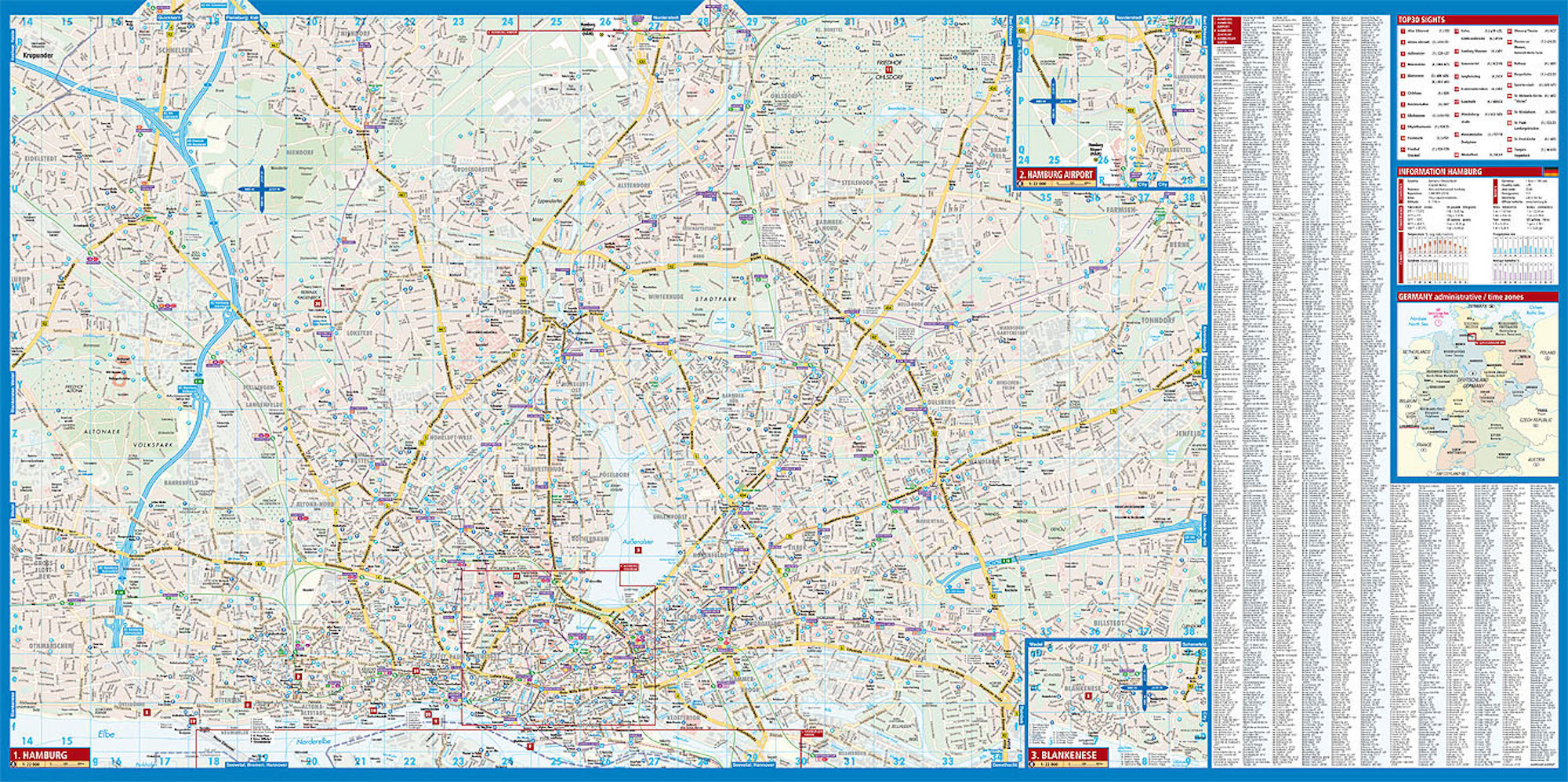 Einzelkarten: Hamburg 1:22 000, Hamburg Zentrum 1:10 500, Blankenese 1:22 000, Hamburg Flughafen 1:22 000, Hamburger Hafen 1:25 000, Großraum Hamburg 1:130 000, Nahverkehrskarte HVV, Germany administrative & time zone