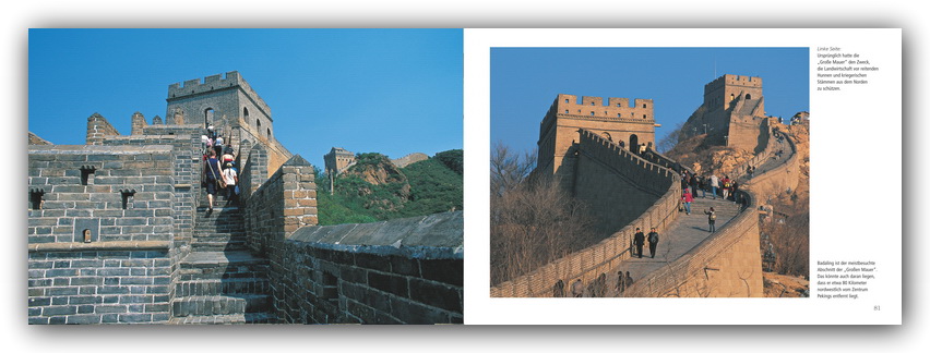 Für welches Land träfe die Charakterisierung als „Land der Kontraste“ besser zu als für das Reich der Mitte? Prächtige Palastanlagen, Tempel und Gärten einer jahrtausendealten Hochkultur liegen im Schatten gläserner Wolkenkratzer, boomende Wirtschaftsmetropolen stehen neben ländlichen Gebieten, in denen die Zeit stehen geblieben zu sein scheint. Der Kaiserpalast in Peking trifft auf modernistische Bauten für die Olympiade 2008, alte Klöster und die von 50 000 Buddha-Statuen bevölkerten Yungang-Shiku-Grotten prägen Datong, bunte Basare die Karawanenstationen entlang der Seidenstraße.