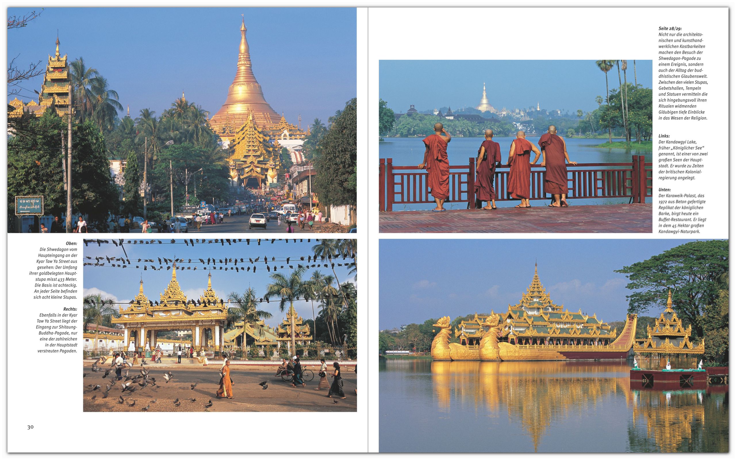 Burma, oder auch Myanmar, der Vielvölkerstaat in Südostasien, bietet eine unvergleichliche Vielfalt an Landschaften: Traumstrände an den Küsten des Indischen Ozeans und Andamanischen Meeres, Sumpfgebiete und hohe Gipfel im Rakhaing-Yoma-Gebirge oder Kachin-Bergland, einem Ausläufer des Himalaya. Zahlreiche Zeugnisse der wechselvollen Geschichte faszinieren den Besucher: Die Shwedagon-Pagode ist ganz mit Gold bedeckt, in der alten Hauptstadt Bagan findet man über 2000 Sakralbauten aus vier Jahrhunderten.Über 230 Fotos zeigen Burma in all seinen Facetten, vier Specials berichten unter anderem über Kunsthandwerk und kulinarische Genüsse.