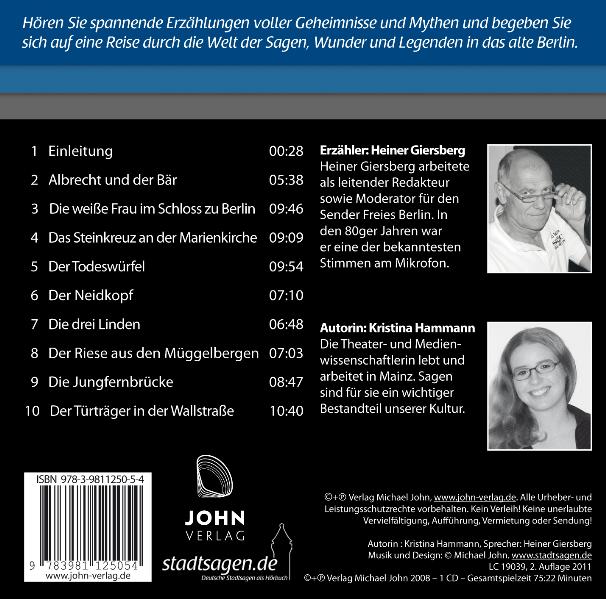 01) Einleitung02) Albrecht der Bär03) Die weiße Frau im Schloss zu Berlin04) Das Steinkreuz an der Marienkirche05) Der Todeswürfel06) Der Neidkopf07) Die drei Linden08) Der Riese aus den Müggelbergen09) Die Jungfernbrücke10) Der Türträger in der Wallstraße