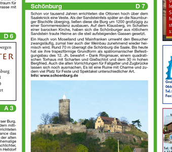 Die Rad- und Wanderkarte präsentiert im Kartenausschnitt Rad- und Wanderwege rund um den Naturpark Saale-Unstrut-Triasland. Das regenarme Gebiet lädt zu Wanderungen und Radtouren entlang der Flüsse, durch die hügeligen Wälder oder die terrassenförmigen Weinberge ein. Weitere Highlights: die 3.600 Jahre alte Himmelsscheibe in Nebra sowie zahlreiche Burgen und mittelalterlich geprägte Orte wie Allstedt und Naumbug, über die die Rückseite der Rad- und Wanderkarte informiert.