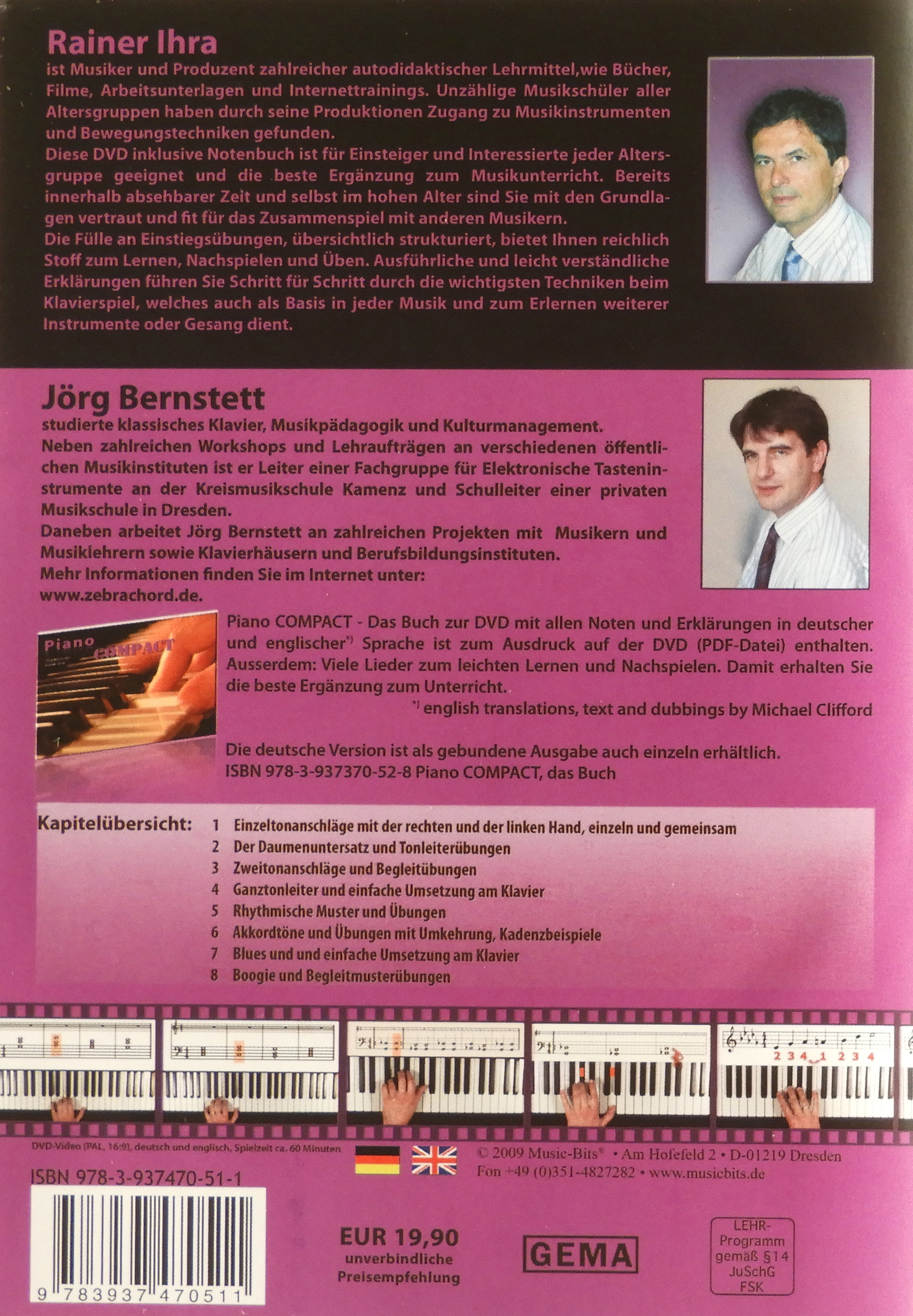 Diese DVD inklusive Notenbuch ist für Einsteiger und Interessierte jeder Altersgruppe geeignet und die beste Ergänzung zum Musikunterricht. Bereits innerhalb absehbarer Zeit und selbst im hohen Alter sind Sie mit den Grundlagen vertraut und fit für das Zusammenspiel mit anderen Musikern. Die Fülle an Einstiegsübungen, übersichtlich strukturiert, bietet Ihnen reichlich Stoff zum Lernen, Nachspielen und Üben. Ausführliche und leicht verständliche Erklärungen führen Sie Schritt für Schritt durch die wichtigsten Techniken beim Klavierspiel, welches auch als Basis in jeder Musik und zum Erlernen weiterer Instrumente oder Gesang dient.