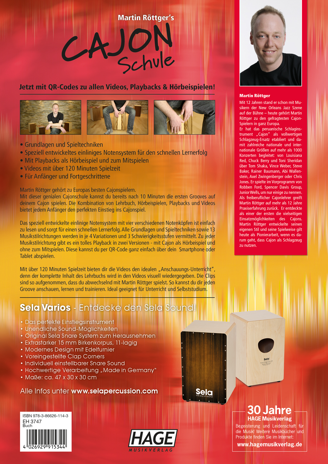 Martin Röttger gehört zu Europas besten Cajonspielern. Mit dieser genialen Cajonschule kannst du bereits nach 10 Minuten die ersten Grooves auf deinem Cajon spielen. Die Kombination von Lehrbuch, Hörbeispielen, Playbacks und Videos bietet jedem Anfänger den perfekten Einstieg ins Cajonspiel.Das speziell entwickelte einlinige Notensystem mit vier verschiedenen Notenköpfen ist einfach zu lesen und sorgt für einen schnellen Lernerfolg. Alle Grundlagen und Spieltechniken sowie 13 Musikstilrichtungen werden in je 4 Variationen und 3 Schwierigkeitsstufen vermittelt. Zu jeder Musikstilrichtung gibt es ein tolles Playback in zwei Versionen - mit Cajon alsHörbeispiel und ohne zum Mitspielen. Diese kannst du per QR-Code ganz einfach über dein Smartphone oder Tablet abspielen.Mit über 120 Minuten Spielzeit bieten dir die Videos den idealen "Anschauungs-Unterricht", denn der komplette Inhalt des Lehrbuchs wird in den Videos visuell wiedergegeben. Die Clips sind so aufgenommen, dass du abwechselnd mit Martin Röttger spielst. So kannst du dir jeden Groove anschauen, lernen und trainieren. Ideal geeignet für Unterricht und Selbststudium.
