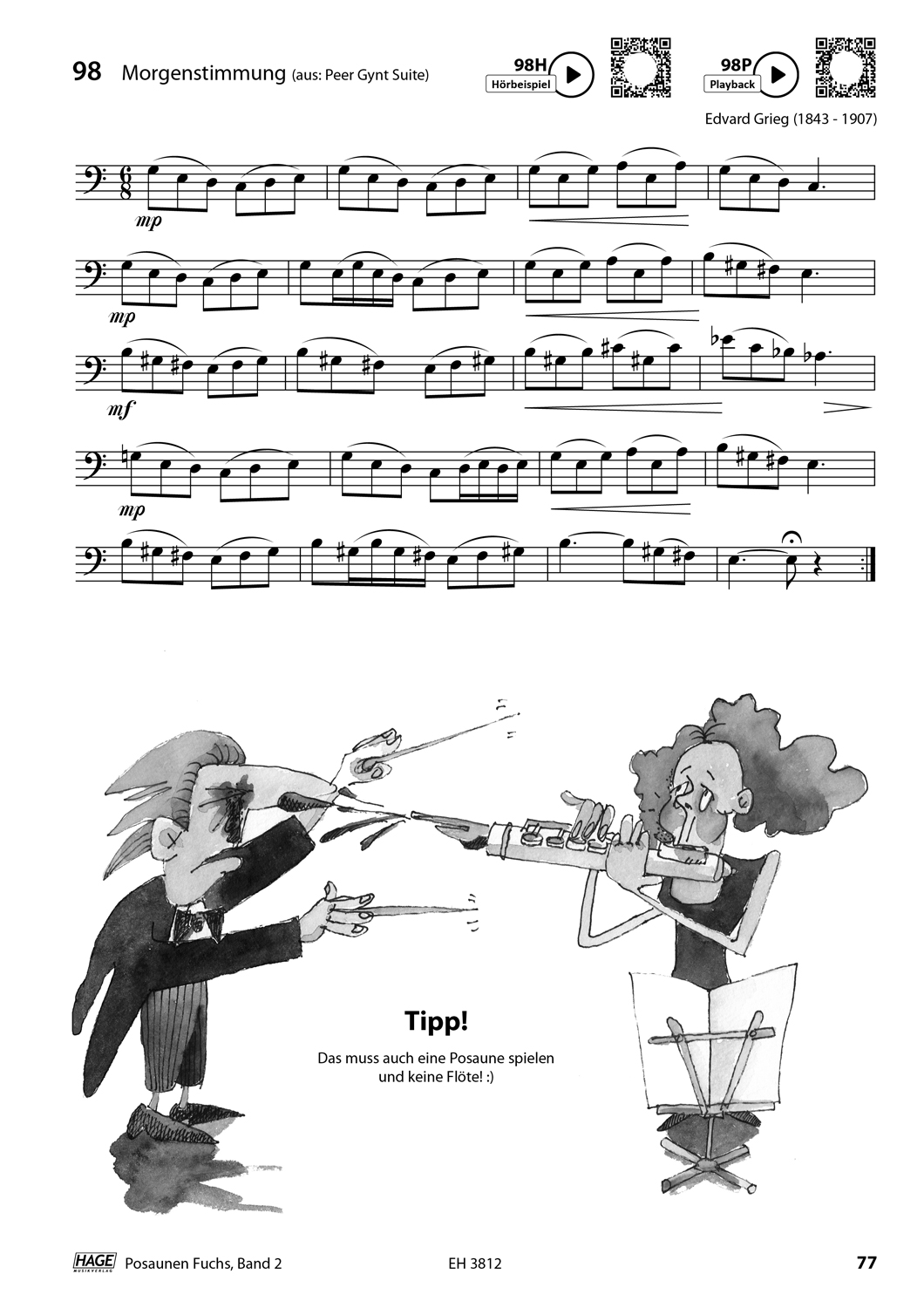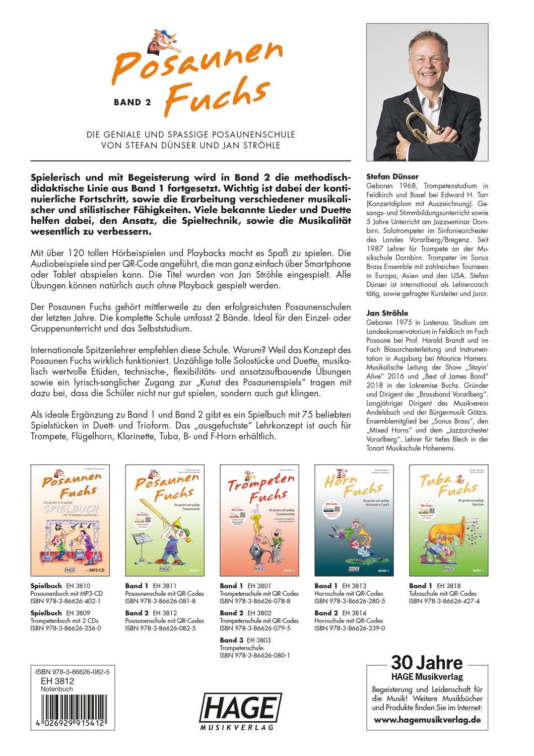 Spielerisch und mit Begeisterung wird in Band 2 die methodischdidaktische Linie aus Band 1 fortgesetzt. Wichtig ist dabei der kontinuierliche Fortschritt, sowie die Erarbeitung verschiedener musikalischer und stilistischer Fähigkeiten. Viele bekannte Lieder und Duette helfen dabei, den Ansatz, die Spieltechnik, sowie die Musikalität wesentlich zu verbessern.Mit über 120 tollen Hörbeispielen und Playbacks macht es Spaß zu spielen. Die Audiobeispiele sind per QR-Code angeführt, die man ganz einfach über Smartphone oder Tablet abspielen kann. Die Titel wurden von Jan Ströhle eingespielt. Alle Übungen können natürlich auch ohne Playback gespielt werden. Der Posaunen Fuchs gehört mittlerweile zu den erfolgreichsten Posaunenschulen der letzten Jahre. Die komplette Schule umfasst 2 Bände. Ideal für den Einzel- oder Gruppenunterricht und das Selbststudium.Internationale Spitzenlehrer empfehlen diese Schule. Warum? Weil das Konzept des Posaunen Fuchs wirklich funktioniert. Unzählige tolle Solostücke und Duette, musikalisch wertvolle Etüden, technische-, flexibilitäts- und ansatzaufbauende Übungen sowie ein lyrisch-sanglicher Zugang zur "Kunst des Posaunenspiels" tragen mit dazu bei, dass die Schüler nicht nur gut spielen, sondern auch gut klingen.Als ideale Ergänzung zu Band 1 und Band 2 gibt es ein Spielbuch mit 75 beliebten Spielstücken in Duett- und Trioform. Das "ausgefuchste" Lehrkonzept ist auch für Trompete, Flügelhorn, Klarinette, Tuba, B- und F-Horn erhältlich.