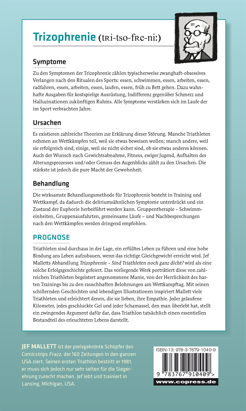 Das Leben als Triathlet ist schön – aber auch ein bisschen verrückt. Jef Mallett, erfolgreicher US-Cartoonist und passionierter Triathlet, liefert in vorliegendem Band eine ebenso humorvolle wie sachkundige Beschreibung einer Sportart, die eigentlich aus drei Sportarten besteht: Ein unterhaltsames Lesevergnügen für jeden Triathleten, der seinem Glück in der 'schönsten aller Dreiteilungen' auf der Spur ist.