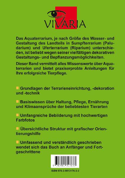 I. DAS AQUATERRARIUM 5Beschreibung 5Rückwand 6Dekoration 11Bodengrund 15Bepflanzung 19II. TERRARIENTECHNIK 22Feuchtigkeit 22Temperatur 26Beleuchtung 32III. TERRARIENTIERE IM PORTRÄT 39Erläuterung der Porträts 39Australische Wasseragame (Physignathus lesueurii) 42Australischer Korallenfinger-Laubfrosch (Pelodryas caerulea) 45Chinesische Dreikielschildkröte (Chinemys reevesii) 48Chinesische Rotbauchunke (Bombina orientalis) 51Chinesischer Feuerbauchmolch (Cynops orientalis) 54Gebänderte Wassernatter (Nerodia fasciata) 57Gefleckter Tigersalamander (Ambystoma tigrinum melanostictum) 60Gewöhnliche Moschus-Schildkröte (Sternotherus odoratus) 63Grüne Wasseragame (Physignathus cocincinus) 66Mississippi-Höckerschildkröte (Graptemys pseudogeographica kohnii) 70Rotaugen-Laubfrosch (Agalychnis callidryas) 73Spanischer Rippenmolch (Pleurodeles waltl) 76Tomatenfrosch (Dyscophus guineti) 79IV. SERVICESEITEN 83Hilfreiche Adressen 83Zeitschriften & Internet 85Glossar 86LITERATURVERZEICHNIS 89STICHWORTVERZEICHNIS 90BILDQUELLENNACHWEIS 93DER AUTOR / DANKSAGUNG 94
