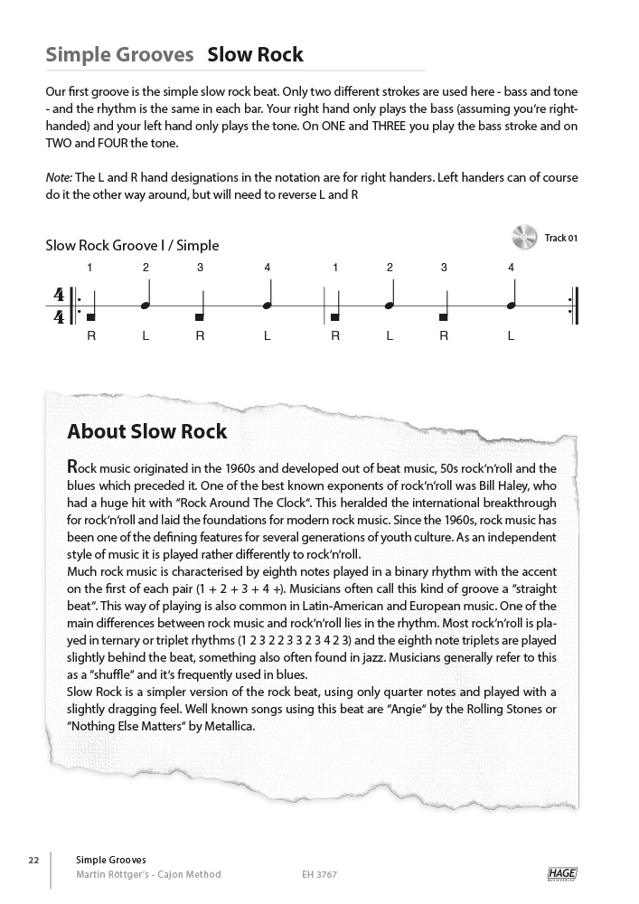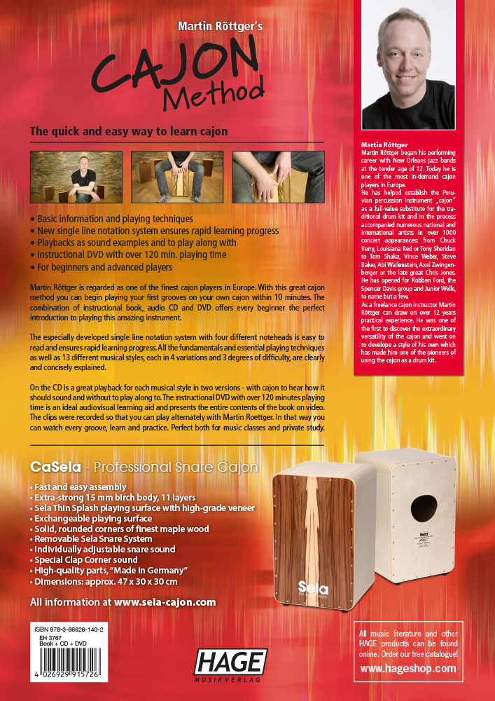 Martin Röttger is regarded as one of the finest cajon players in Europe. With his great new cajon method you can begin playing your first grooves on your own cajon within 10 minutes. The combination of instructional book, audio CD and DVD offers every beginner the perfect introduction to playing this amazing instrument. The newly developed single line notation system with four different noteheads is easy to read and ensures rapid learning progress. All the fundamentals and essential playing techniques as well as 13 different musical styles, each in 4 variations and 3 degrees of difficulty, are clearly and concisely explained. On the CD is a great playback for each musical style in two versions - with cajon to hear how it should sound and without to play along to. The instructional DVD with over 120 minutes playing time is an ideal audiovisual learning aid and presents the entire contents of the book on video. Perfect both for music classes and private study.