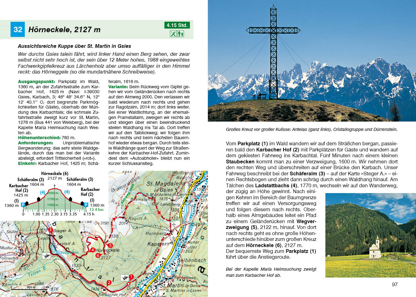 Unter Wander- und Bergfreunden wird die Region im Osten Südtirols (noch!) als Geheimtipp gehandelt. Und das, obwohl dort schon immer eine landschaftliche Vielfalt lockt, die seinesgleichen sucht: auf der einen Seite, rund um den majestätischen Hochgall, der über dreitausend Meter aufragende, von spektakulären Gletschern verzierte Naturpark Rieserferner, auf der anderen Seite die grünen Almlandschaften um das benachbarte Gsieser Tal und direkt gegenüber, südlich des Hochpustertals, die jäh ins Himmelsblau spitzenden Felszinnen der Sextener und Pragser Dolomiten. Auch für dieses Gebiet finden sich Tourenvorschläge in dem Buch, so z. B. die großartige Runde um die Drei Zinnen. Im Südosten der Region ragt auch der Karnische Hauptkamm in die vorgestellte Region. Dort, wie auch um den Staller Sattel verlaufen einige Routen auch über benachbarte Areale Osttirols schön, dass die Grenze zwischen Italien und Österreich hier praktisch keine Rolle mehr spielt!