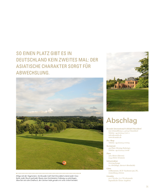Die Redaktion dieses Buches hat allerdings noch einen anderen Schwerpunkt gesetzt als lediglich Platzqualität, Design und Infrastruktur. Wichtig waren bei unserer Auflistung auch die Erholungs- und Familientauglichkeit. Denn was nützt der beste Platz mit den schnellsten Grüns, wenn er nicht auch touristischen Ansprüchen genügt? Ein Golf-Wochenende auf dem Lande oder eine kombinierte Golf- und Städtereise steht bei vielen Freunden des kleinen weißen Balls auf der jährlichen Reiseplanung. Wir haben in unserem Buch bewusst einerseits Plätze nominiert, auf denen man eine ruhige Kugel schieben kann. Und andererseits solche, die den Tiger in einem wecken. Machen Sie sich auf Überraschungen gefasst...