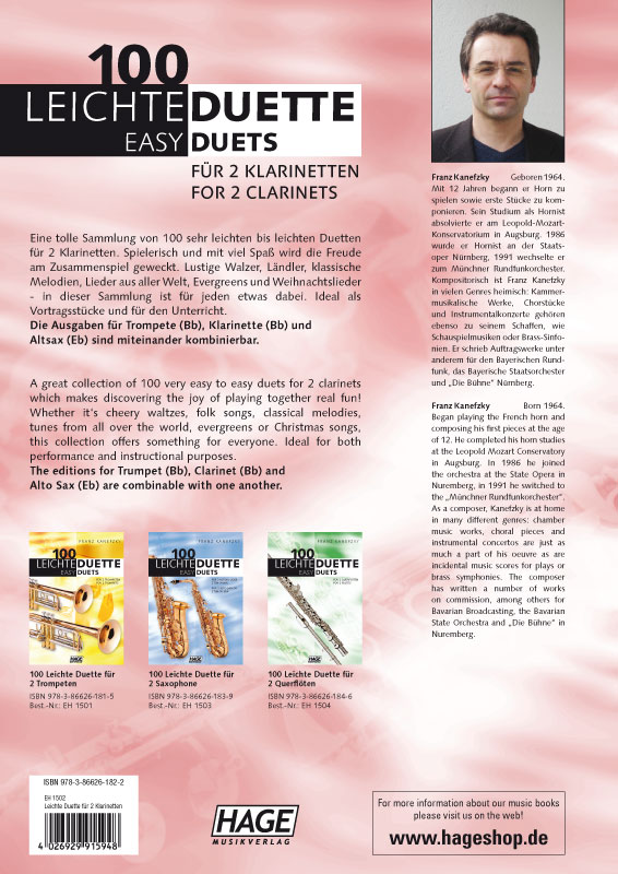 Eine tolle Sammlung von 100 sehr leichten bis leichten Duetten für 2 Klarinetten. Spielerisch und mit viel Spaß wird die Freude am Zusammenspiel geweckt. Lustige Walzer, Ländler, klassische Melodien, Lieder aus aller Welt, Evergreens und Weihnachtslieder - in dieser Sammlung ist für jeden etwas dabei. Ideal als Vortragsstücke und für den Unterricht.Die Ausgaben:100 Leichte Duette für 2 Trompeten (Bb), Best.-Nr. 1501, ISBN 978-3-86626-181-5 100 Leichte Duette für 2 Klarinetten (Bb), Best.-Nr. 1502, ISBN 978-3-86626-182-2100 Leichte Duette für 2 Altsax (Eb), Best.-Nr. 1503, ISBN 978-3-86626-183-9 sind miteinander kombinierbar.