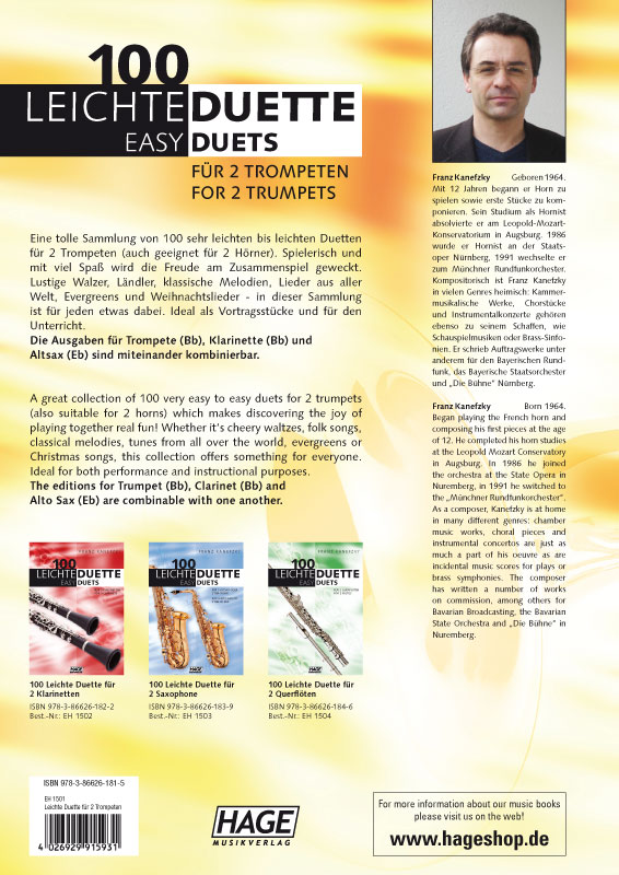 Eine tolle Sammlung von 100 sehr leichten bis leichten Duetten für 2 Trompeten (auch geeignet für 2 Hörner). Spielerisch und mit viel Spaß wird die Freude am Zusammenspiel geweckt. Lustige Walzer, Ländler, klassische Melodien, Lieder aus aller Welt, Evergreens und Weihnachtslieder - in dieser Sammlung ist für jeden etwas dabei. Ideal als Vortragsstücke und für den Unterricht.