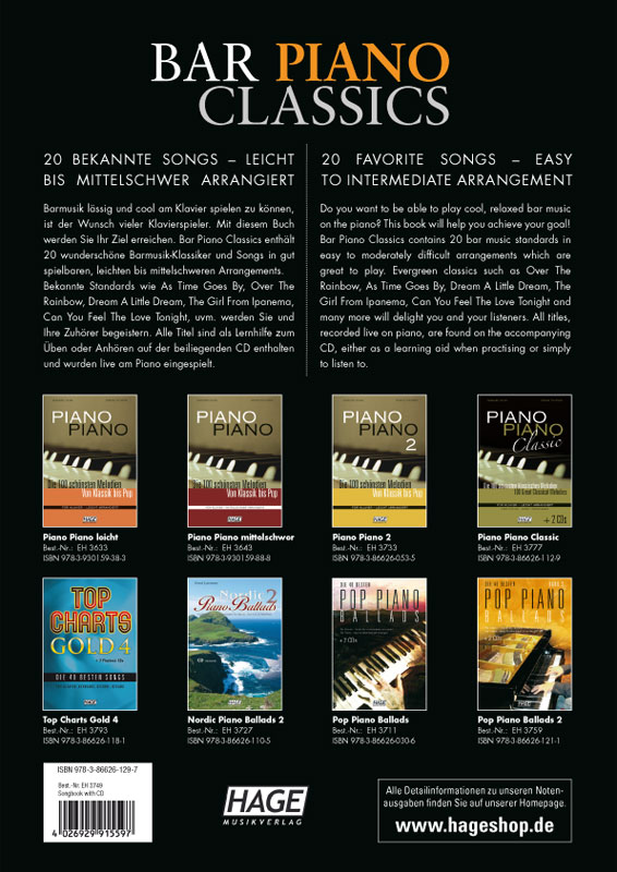 Barmusik lässig und cool am Klavier spielen zu können, ist der Wunsch vieler Klavierspieler. Mit diesem Buch werden Sie Ihr Ziel erreichen.Bar Piano Classics enthält 20 wunderschöne Barmusik-Klassiker und Songs in gut spielbaren, leichten bis mittelschweren Arrangements. Bekannte Standards wie As Time Goes By, Over The Rainbow, Dream A Little Dream, The Girl From Ipanema, Can You Feel The Love Tonight, uvm. werden Sie und Ihre Zuhörer begeistern. Alle Titel sind als Lernhilfe zum Üben oder Anhören auf der beiliegenden CD enthalten und wurden live am Piano eingespielt.