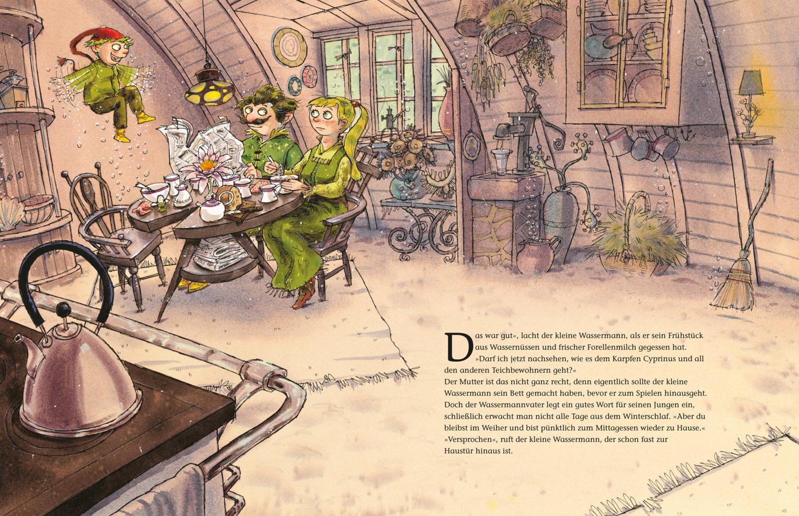Es ist Frühling! Die ersten wärmenden Sonnenstrahlen erreichen den Grund des Mühlenweihers. Auch der kleine Wassermann erwacht aus dem Winterschlaf. Neugierig und voller Tatendrang macht er sich nach dem Frühstück auf, um seine Umgebung zu erkunden. Ob seine Freunde noch alle da sind?