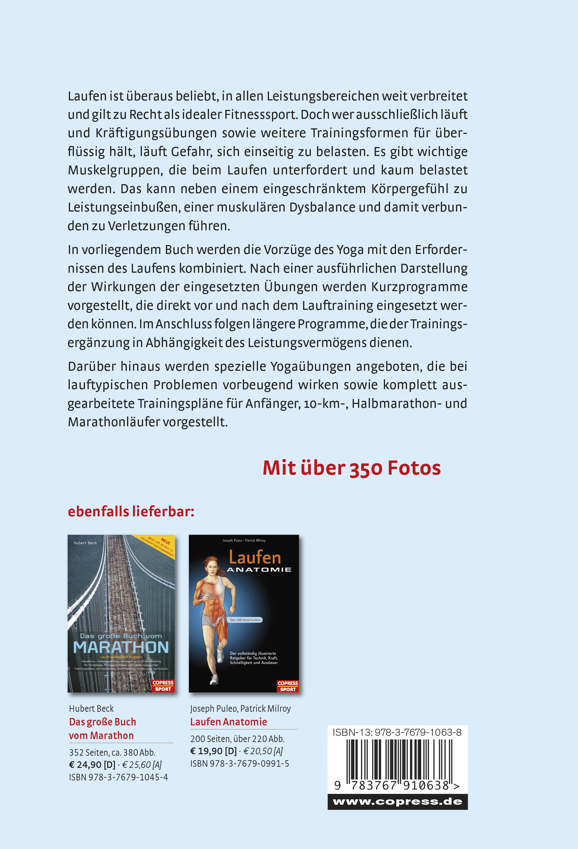 Laufen ist überaus beliebt, in allen Leistungsbereichen weit verbreitet und gilt zu Recht als idealer Fitnesssport. Doch wer ausschließlich läuft und Kräftigungsübungen sowie weitere Trainingsformen für überflüssig hält, läuft Gefahr, sich einseitig zu belasten. Es gibt wichtige Muskelgruppen, die beim Laufen unterfordert und kaum belastet werden. Das kann neben einem eingeschränktem Körpergefühl zu Leistungseinbußen, einer muskulären Dysbalance und damit verbunden zu Verletzungen führen. In vorliegendem Buch werden die Vorzüge des Yoga mit den Erfordernissen des Laufens kombiniert. Nach einer ausführlichen Darstellung der Wirkungen der eingesetzten Übungen werden Kurzprogramme vorgestellt, die direkt vor und nach dem Lauftraining eingesetzt werden können. Im Anschluss folgen längere Programme, die der Trainingsergänzung in Abhängigkeit des Leistungsvermögens dienen. Darüber hinaus werden spezielle Yogaübungen angeboten, die bei lauftypischen Problemen vorbeugend wirken sowie komplett ausgearbeitete Trainingspläne für Anfänger, 10-km-, Halbmarathon- und Marathonläufer vorgestellt.