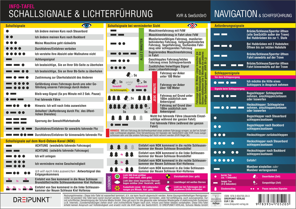 | Schlagworte | Binnen • Dreipunkt • Dreipunkt-Verlag • Info-Tafel • KVR • Lichter auf See • Lichterführung • Lichtsignale • Navigation; Nonbooks • Schall & Licht • Schall & Licht • Schall/Licht • Schallsignale • See • Seeschifffahrtsstraßenordnung • SeeSchStrO • Signal (Schiffahrt) |