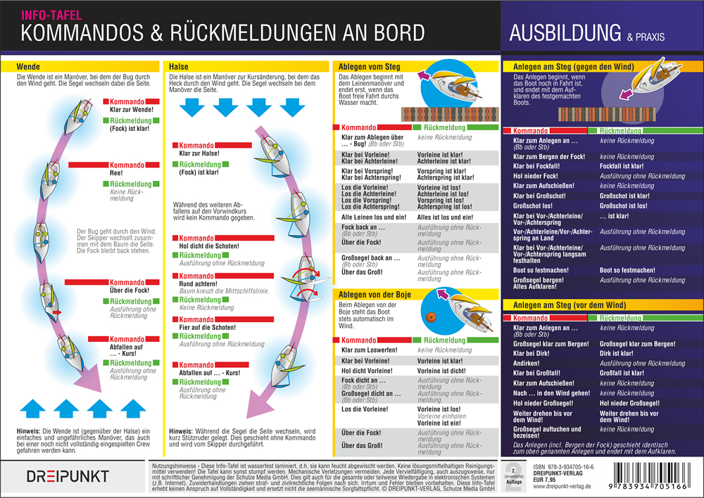 | Schlagworte | Abfallen • Ablegen vom Steg • Anlegen am Steg • Anluven • Aufschießen • Dreipunkt • Dreipunkt-Verlag • Halsen • Info-Tafel • Kommandos • Kommandos an Bord • Reffen • Rückmeldungen • Rückmeldungen an Bord • Ruderführung • Schiften • Segel bergen • Segelboot • Segeljolle • Segelkommando; Nonbooks • Segel setzen • Wenden |