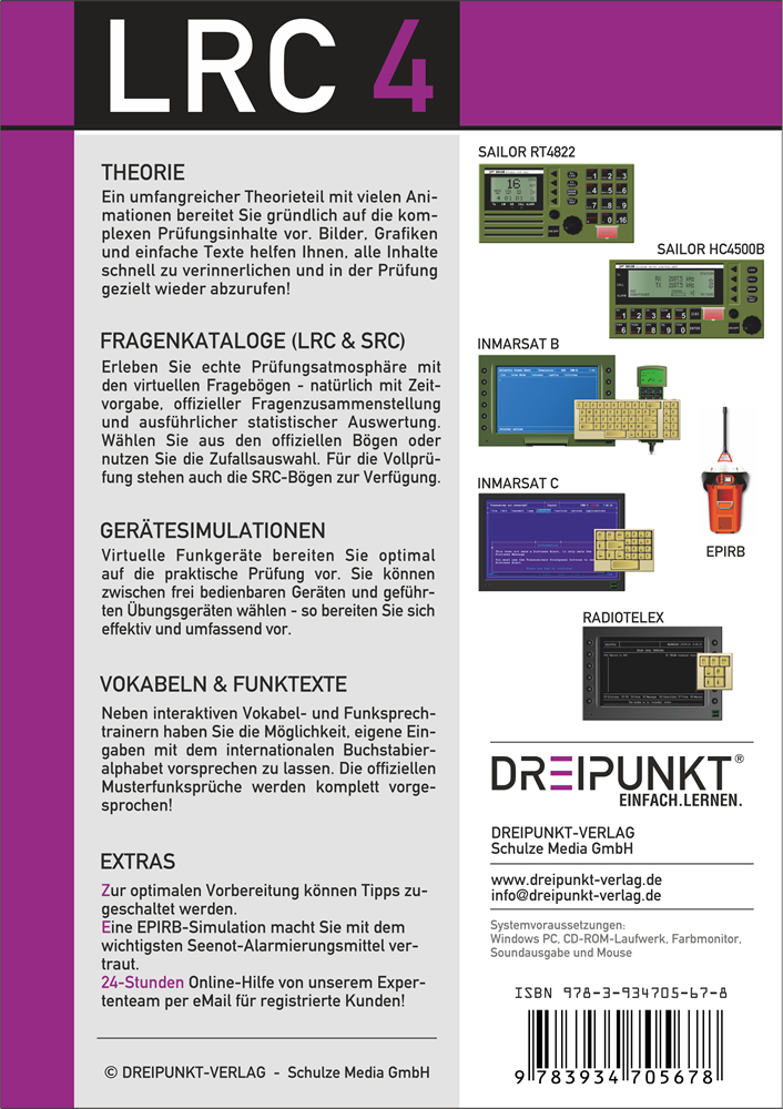 | Schlagworte | Allgemeines Funkbetriebszeugnis (LRC) • Dreipunkt • Dreipunkt-Verlag • Funkausbildung • Funkgerät • Funksprüche • ICOM IC-M505 • Lernprogramm • Long Range Certificate • LRC • PC-Lernsoftware • Prüfung • Software |