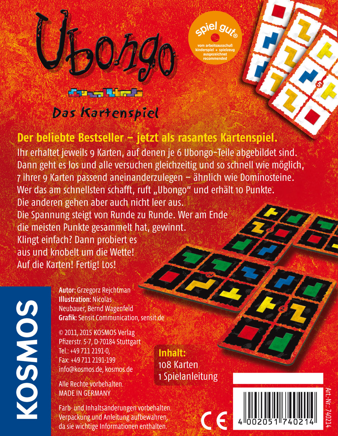 gt; Der beliebte Bestseller als rasantes Kartenspiel. > Der Knobelspaß für unterwegs. Der beliebte Bestseller als rasantes Kartenspiel. Jeder Spieler erhält 9 Karten, auf denen jeweils 6 Ubongo-Teile abgebildet sind. Dann geht es los und alle versuchen gleichzeitig und so schnell wie möglich, 7 ihrer 9 Karten passend aneinanderzulegen - ähnlich wie Dominosteine. Wer das am schnellsten schafft, ruft "Ubongo" und erhält 10 Punkte. Die anderen Spieler gehen aber auch nicht leer aus. Die Spannung steigt von Runde zu Runde. Wer am Ende die meisten Punkte gesammelt hat, gewinnt. Klingt einfach? Einfach ausprobieren und um die Wette knobeln! Auf die Karten! Fertig! Los! Kartenspiel für 2 - 4 Spieler ab 8 Jahren. Spieldauer: ca. 20 Minuten.