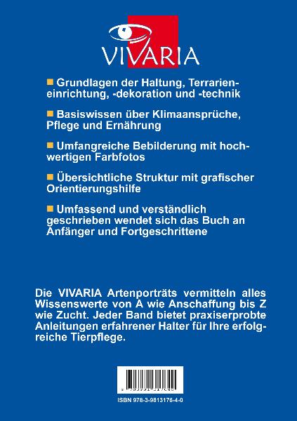 FAMILIE & GATTUNG 7VERBREITUNG & LEBENSRAUM 11HABITATKLIMA 13ANSCHAFFUNG 19Auswahl 19Transport 20Quarantäne 20BESCHREIBUNG 21Allgemeine Morphologie 21Geschlechtsbestimmung 26VERHALTEN 29Allgemeine Verhaltensweisen 29Thermoregulation 29Soziale Interaktion 31Verhalten in menschlicher Obhut 33TERRARIUM 35EINRICHTUNG 37Rückwand 37Bodengrund 38Dekoration 39TERRARIENTECHNIK 41ERNÄHRUNG 45Nahrungsspektrum 45Ergänzungsfuttermittel 49Wasserbedarf 49PFLEGE 52Hygiene 52Greifen und Halten 52Winterruhe 53Haltungsfehler vermeiden 55Krankheiten 57ZUCHT 58Paarung 58Eiablage und Inkubation 61Schlupf und Aufzucht 64ADRESSEN & ZEITSCHRIFTEN 67GLOSSAR 69LITERATURVERZEICHNIS 71STICHWORTVERZEICHNIS 74BILDQUELLENNACHWEIS 77DANKSAGUNG 77DIE AUTOREN 78