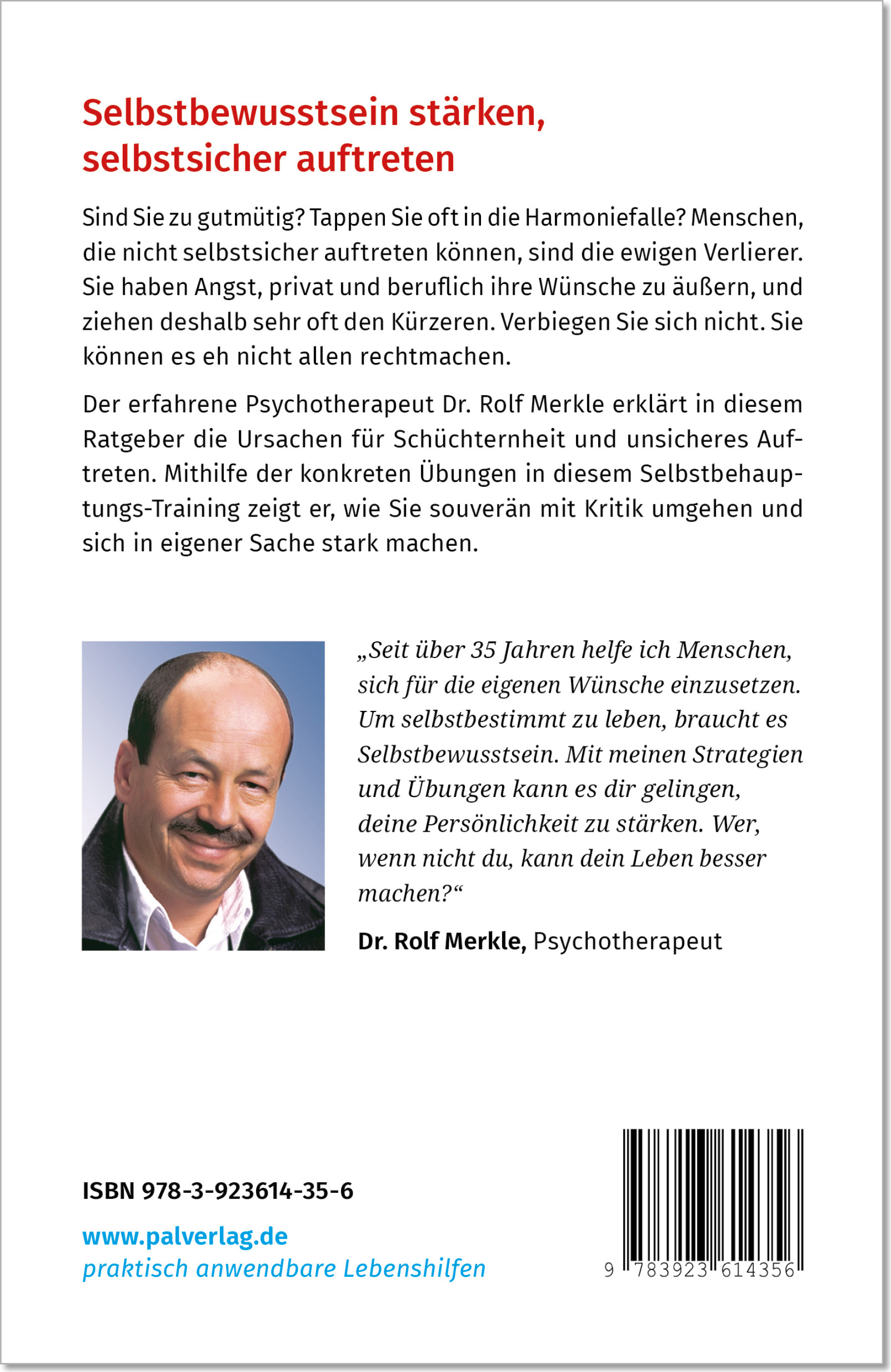 Selbstbewusstes Auftreten ist reine Übungssache! Schon wieder Ja gesagt, wo ein Nein angebrachter gewesen wäre? Oder einem Konflikt aus dem Weg gegangen, weil es an Durchsetzungsvermögen fehlte? Mangelndes Selbstwertgefühl und die Angst vor Ablehnung hindern uns daran, für unsere Rechte einzustehen, und machen uns anfällig für Energieräuber und manipulative Menschen.Der erfahrene Therapeut Dr. Rolf Merkle geht diese Probleme gezielt mit Ihnen an: Lernen Sie, wie Sie Ihr Selbstbewusstsein stärken, die eigenen Bedürfnisse äußern und sich in Konfliktsituationen nicht unnötig klein machen. Wie man Durchsetzungskraft entwickelt und sein Selbstvertrauen aufbauen kann Richtig reagieren: Vom Umgang mit Kritik und unberechtigten Forderungen Mit Denkanstößen und bewährten Tipps aus dem therapeutischen Alltag Übungen, die wirken: Seine Meinung sagen, Komplimente annehmen, selbstbewusste Körperhaltung ... Vom Co-Autor des Lebensfreude-Kalenders im PAL Verlag, Dr. Rolf Merkle Eine gute Basis schaffen: Selbstsicherheit kommt vor Selbstbehauptung Wenn wir der Meinung sind, Anerkennung und Beachtung verdient zu haben, lassen wir uns nicht so schnell verunsichern und treten souveräner auf. Sich selbst lieben und ein positives Selbstbild entwickeln sind deswegen unabdingbare Voraussetzungen, wenn man für sich einstehen und aus dem Schatten der anderen heraustreten möchte. Verabschieden Sie sich von Harmoniesucht und unnötiger Schüchternheit! Mit unserem praktischen Ratgeber erkennen Sie Manipulationsversuche im privaten und beruflichen Alltag und finden Sie schnell zu mehr Souveränität und Durchsetzungsfähigkeit!