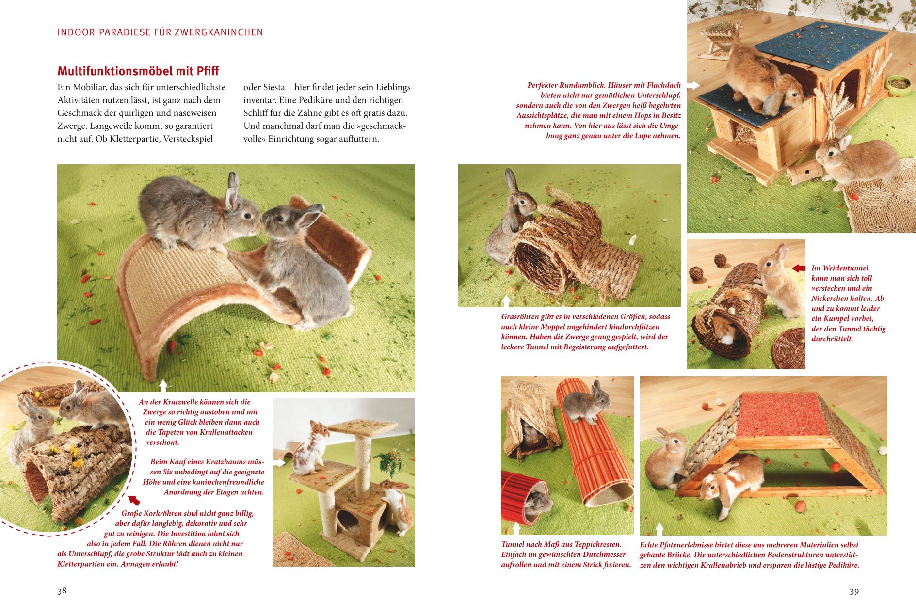 Flinke Hoppler brauchen Bewegungsfreiheit: Die munteren Zwergkaninchen rennen und springen für ihr Leben gern. Grundlage für ein zufriedenes Kaninchenleben ist daher ein abwechslungsreich eingerichtetes Gehege, das den Tieren neben ausreichend Platz auch noch Möglichkeiten zum Buddeln und sich Verstecken bietet. Für die Innenhaltung stellt das Buch ein cleveres Modulsystem, einen Etagenbau für beengte Verhältnisse und multifunktionelles Mobiliar vor und für die Außenhaltung viele pfiffige Einrichtungsideen. Das Zubehör und die Bauten gibt es entweder fertig zu kaufen oder sie lassen sich dank der verständlichen Anleitungen leicht selbst herstellen. Zahlreiche praxiserprobte Solo-, Futter- und Intelligenzspiele sorgen dafür, dass bei Ihren Zwergen garantiert keine Langeweile mehr aufkommt. Und schließlich zeigt ein eigener Abschnitt, wie zwischen Halter und Kaninchen das nötige Vertrauen entsteht, so dass beide viel Freude an gemeinsamen Spielen wie Hürdenspringen und Slalomlauf haben.