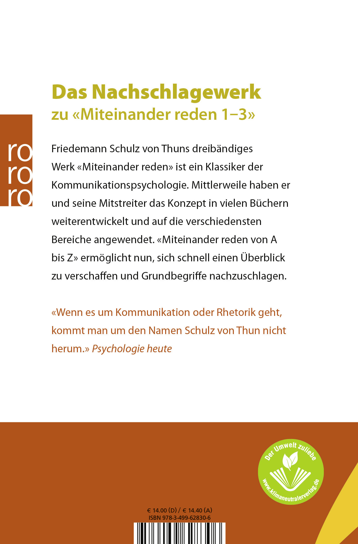 Friedemann Schulz von Thuns dreibändiges Werk «Miteinander reden» ist ein Klassiker der Kommunikationspsychologie. Mittlerweile haben er und seine Mitstreiter das Konzept in vielen Büchern weiterentwickelt und auf die verschiedensten Bereiche angewendet. «Miteinander reden von A bis Z» ermöglicht nun, sich schnell einen Überblick zu verschaffen und Grundbegriffe nachzuschlagen.