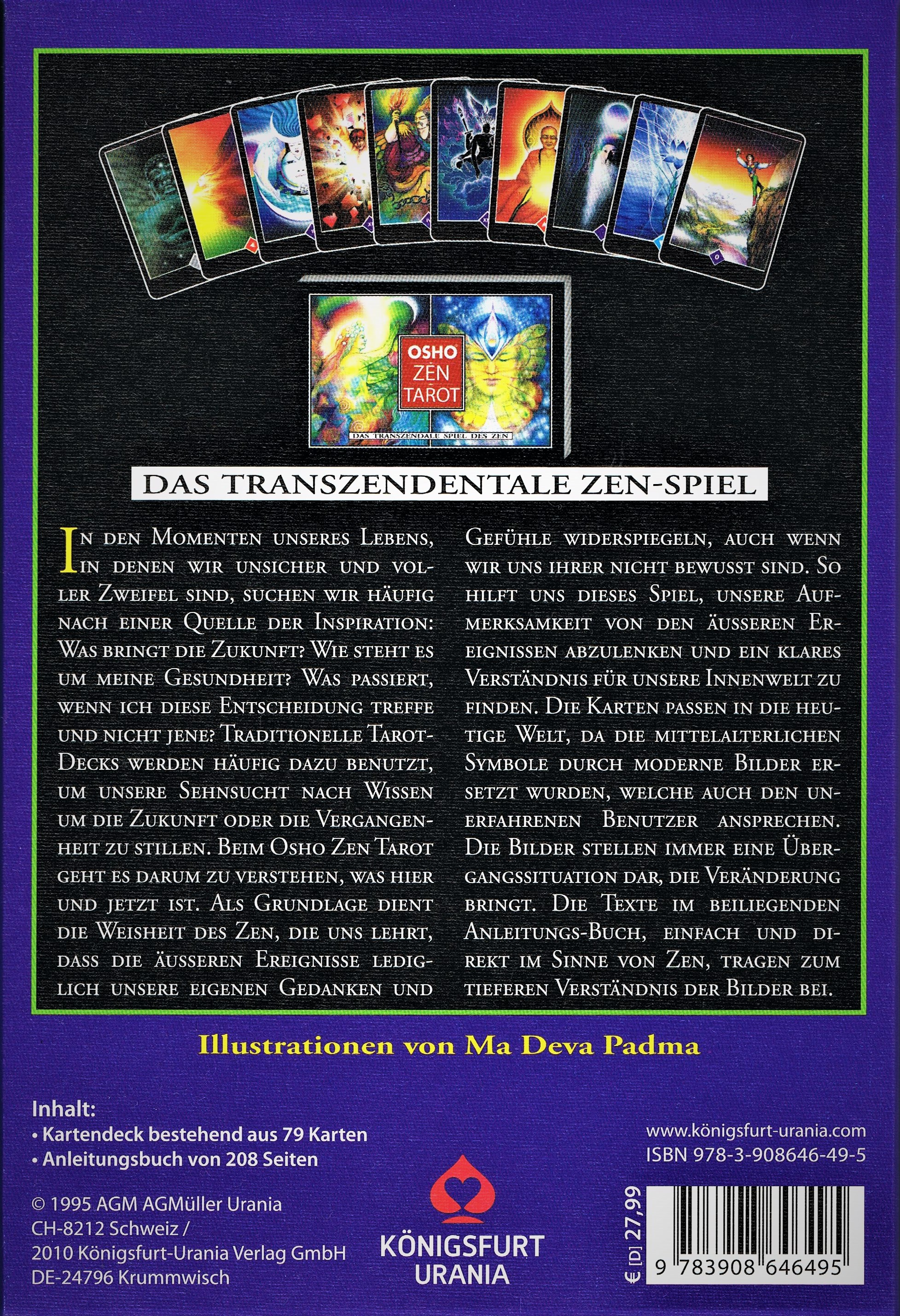Osho Zen TarotTraditionelle Tarot-Decks werden häufig verwendet, um unsere Sehnsucht nach Wissen um die Zukunft oder die Vergangenheit zu stillen. Beim Osho Zen Tarot geht es darum zu verstehen, was HIER und JETZT ist. Als Grundlage dient die Weisheit des Zen, die uns lehrt, dass die äußeren Ereignisse lediglich unsere eigenen Gedanken und Gefühle widerspiegeln, auch wenn wir uns ihrer nicht bewusst sind. So helfen uns diese spirituellen Karten, ein besseres Verständnis unserer Innenwelt und ihrer Transformationen zu bekommen.Das Tarotdeck orientiert sich an der Großen und Kleinen Arkana der klassischen Tarots, bietet aber völlig neue Interpretationen und Bezeichnungen der spirituellen Reise des Menschen: Existenz - Die innere Stimme - Kreativität - Leere - Bewusstheit - Mut - Wandel - Durchbruch - Transformation usw. Auch die Kleine Arkana erscheint in einem neuen Gewand: Verschiedenfarbige Quadrate ersetzen die klassischen Symbole, Bezeichnungen wie Erschöpfung - Reisen - Unterdrückung - Freundlichkeit - Quelle usw. lassen auch hier den direkten Bezug zur Innensicht klarwerden.Die Bilder sind visionär, spirituell, träumerisch, modern und kraftvoll von Ma Deva Padma gestaltet - sie entführen uns in eine farbenreiche Phantasiewelt. Die Texte im beiliegenden Anleitungsbuch sind klar im Sinne von Zen geschrieben und tragen zum tieferen Verständnis bei.Set mit 79 Karten und 200-seitigem Buch.